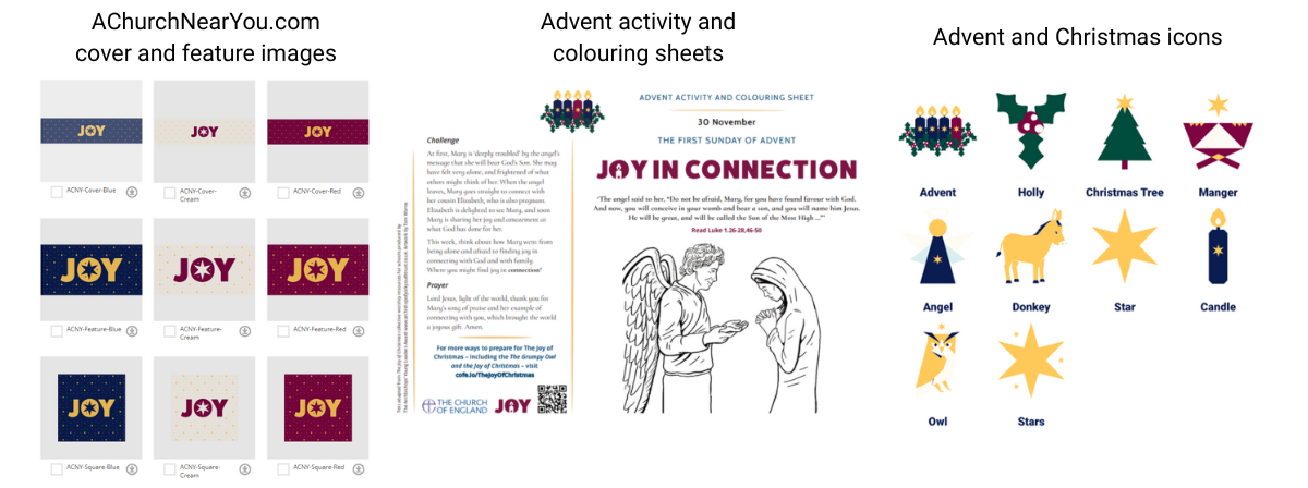 - Advent and Christmas icons for this year’s theme: The Joy of Christmas. We hope you will find these icons useful when creating visual content for your church or benefice. Whether it be for flyers, posters, or adding services and events to your AChurchNearYou.com site, there are various options to mark different events and themes.