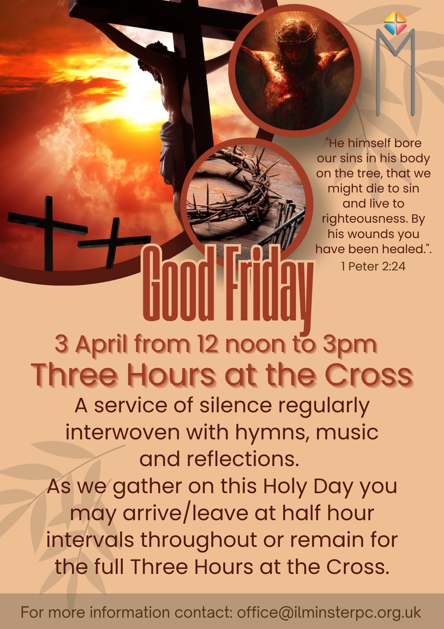 Join us for some, or all, of the three hours at the cross. A service of silence, regularly interwoven with hymns, music and reflections.