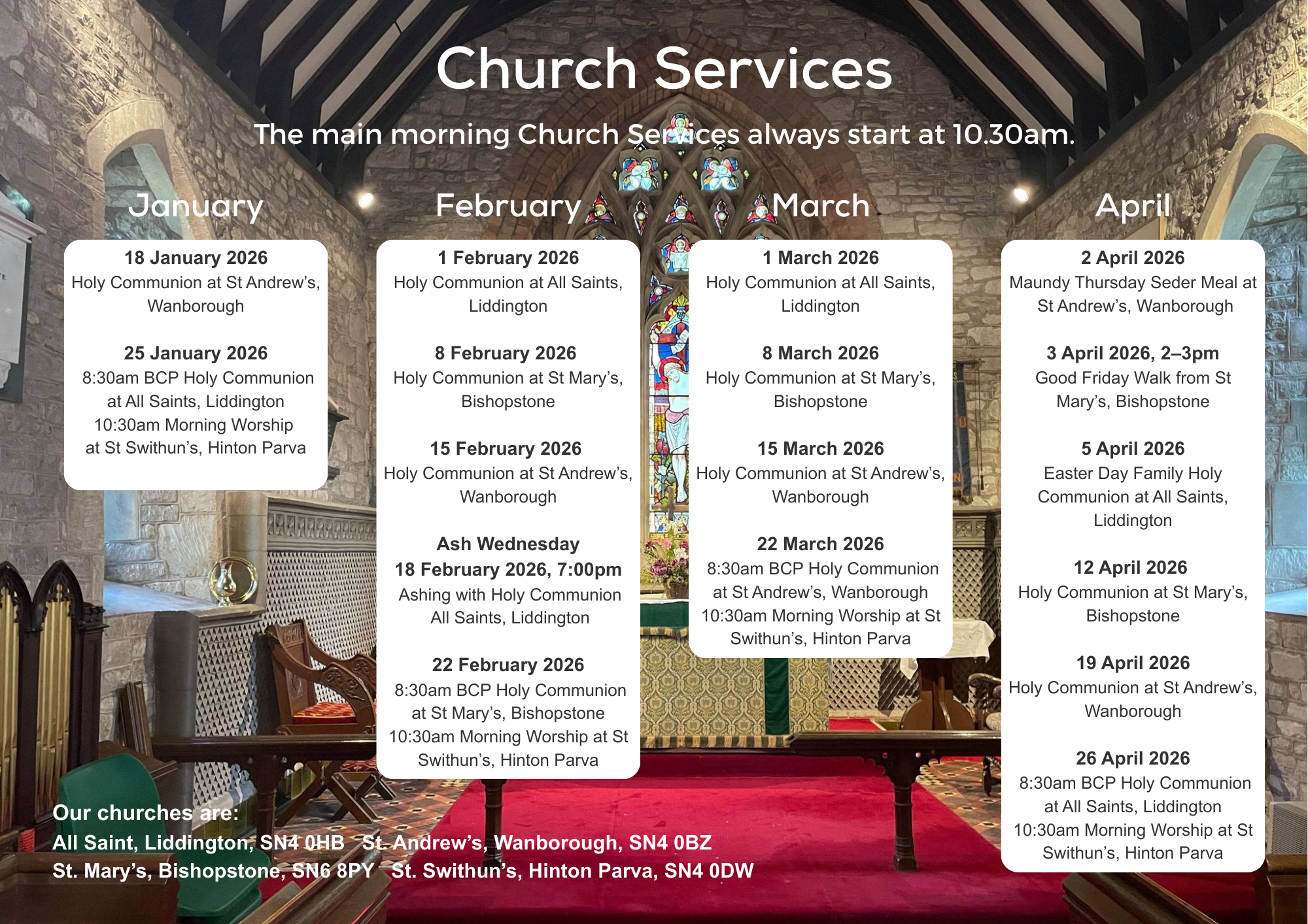 Our service rota for January–April 2026 is shown here. Our main morning service starts at 10.30am, and we often enjoy tea, coffee, and biscuits together afterwards — everyone is very welcome to stay.