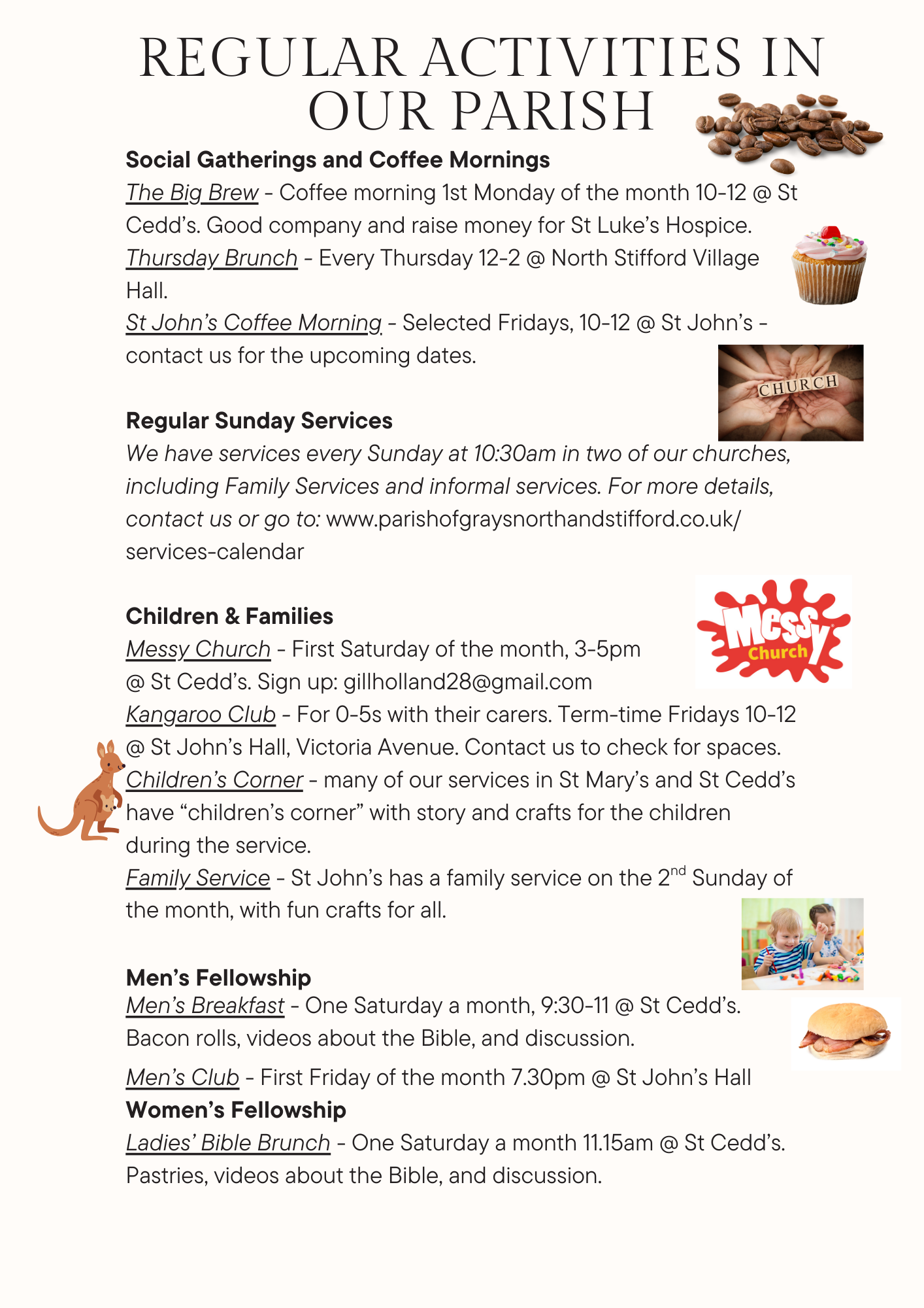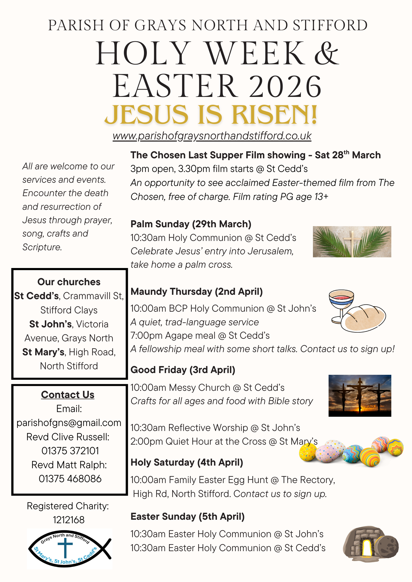 See the attachments on the right hand side for details of all our Easter events, a reminder of our regular events, and our special showing of The Chosen: Last Supper.