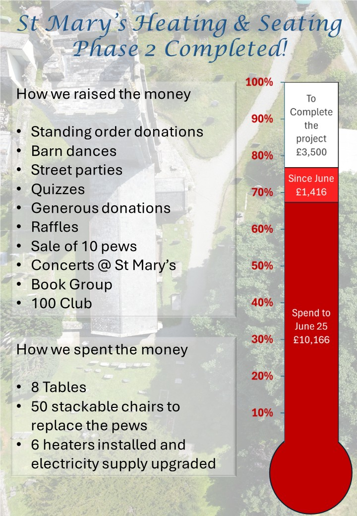 St. Mary's Heating and Seating Fundraising Campaign - Target £15,000With sincere thanks for the tremendous local community support (and especially to the new Sydenham Damerel Parish Meeting) we have done incredibly well and now face the final push to complete this essential improvement project.