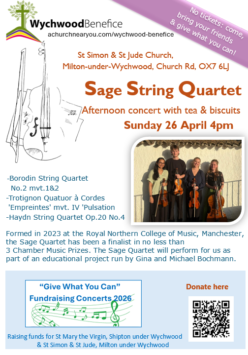 First Concert: The Sage String Quartet: Sunday 26 April 4pm in St Simon & St Jude Church, Milton under Wychwood. See attached leaflet for full details.