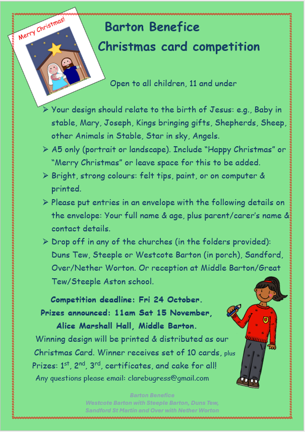 -Drop off in any of the churches (in the folders provided): Duns Tew, Steeple or Westcote Barton (in porch), Sandford, Over/Nether Worton. Or reception at Middle Barton/Great Tew/Steeple Aston
