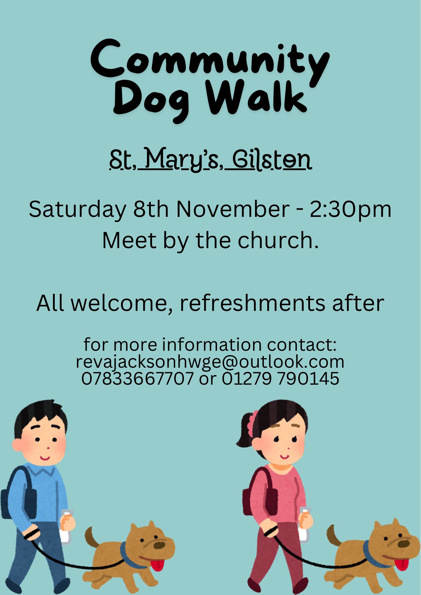 It reminded me that we have our Community Dog Walk on Saturday starting from St Mary’s, Gilston at 2.30 pm and I hope some of you will be able to join us. Christine and Rosemary will be providing their yummy cake as usual (not to be missed) for us at the end of our walk around 4.00 pm. If you don’t want to do the walk but would like the fun of the café, and catching up with friends, please come along – it will be great to have you with us.