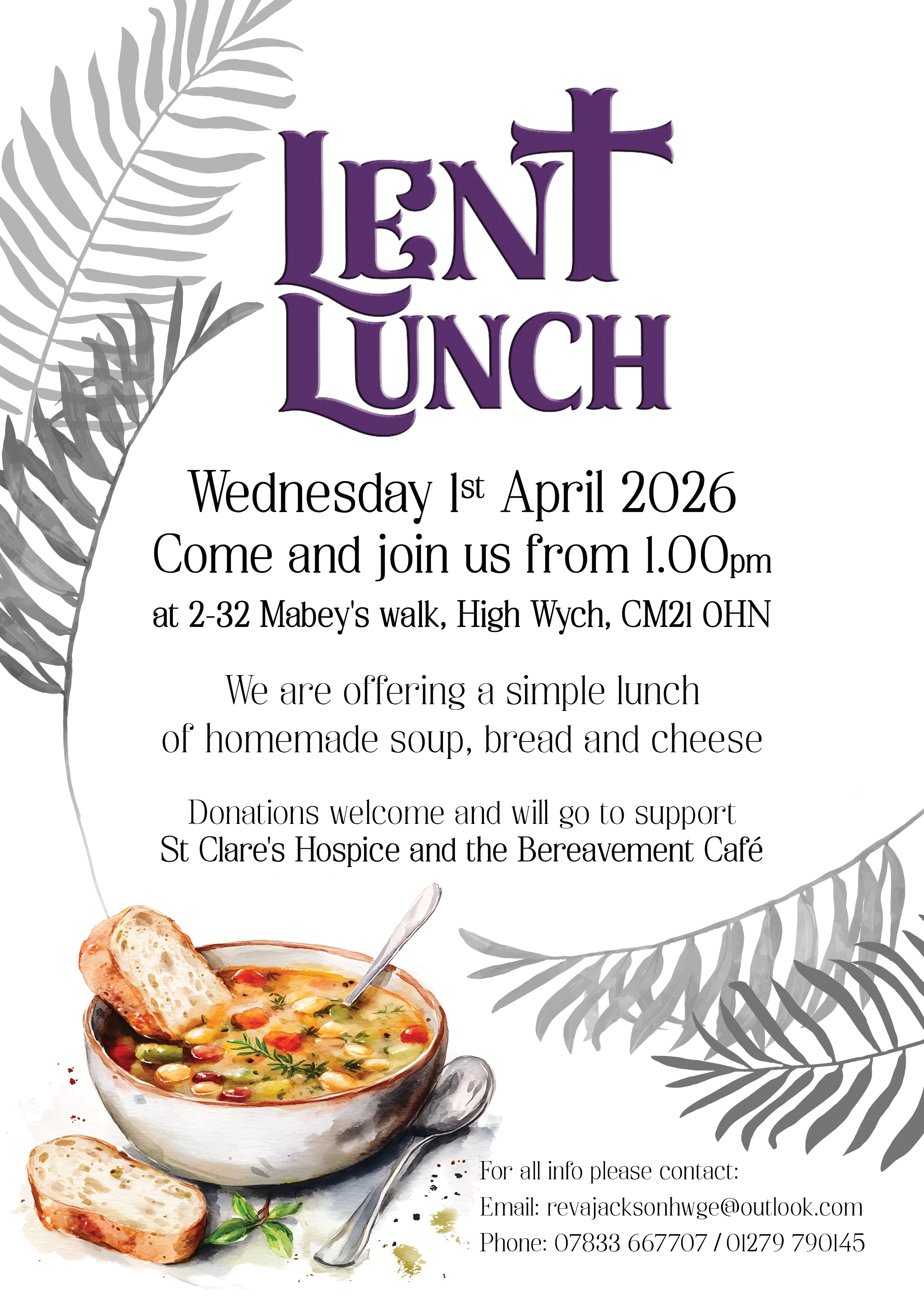 I also attach a flyer for our Lent Lunch for next Wednesday. I hope you can make this as we are hoping to raise some funds for St Clare’s Hospice and the Bereavement Café. This Lent Lunch is being brought to you by the team of Wednesday Welcome and the people who attended our Lent Bible study on Gladness and Generosity. As we remember all that Jesus has done for us, let us worship him with Gladness and Generosity in all that we do. This Lent Lunch is just one way that we can practically show our love for Jesus and his world.