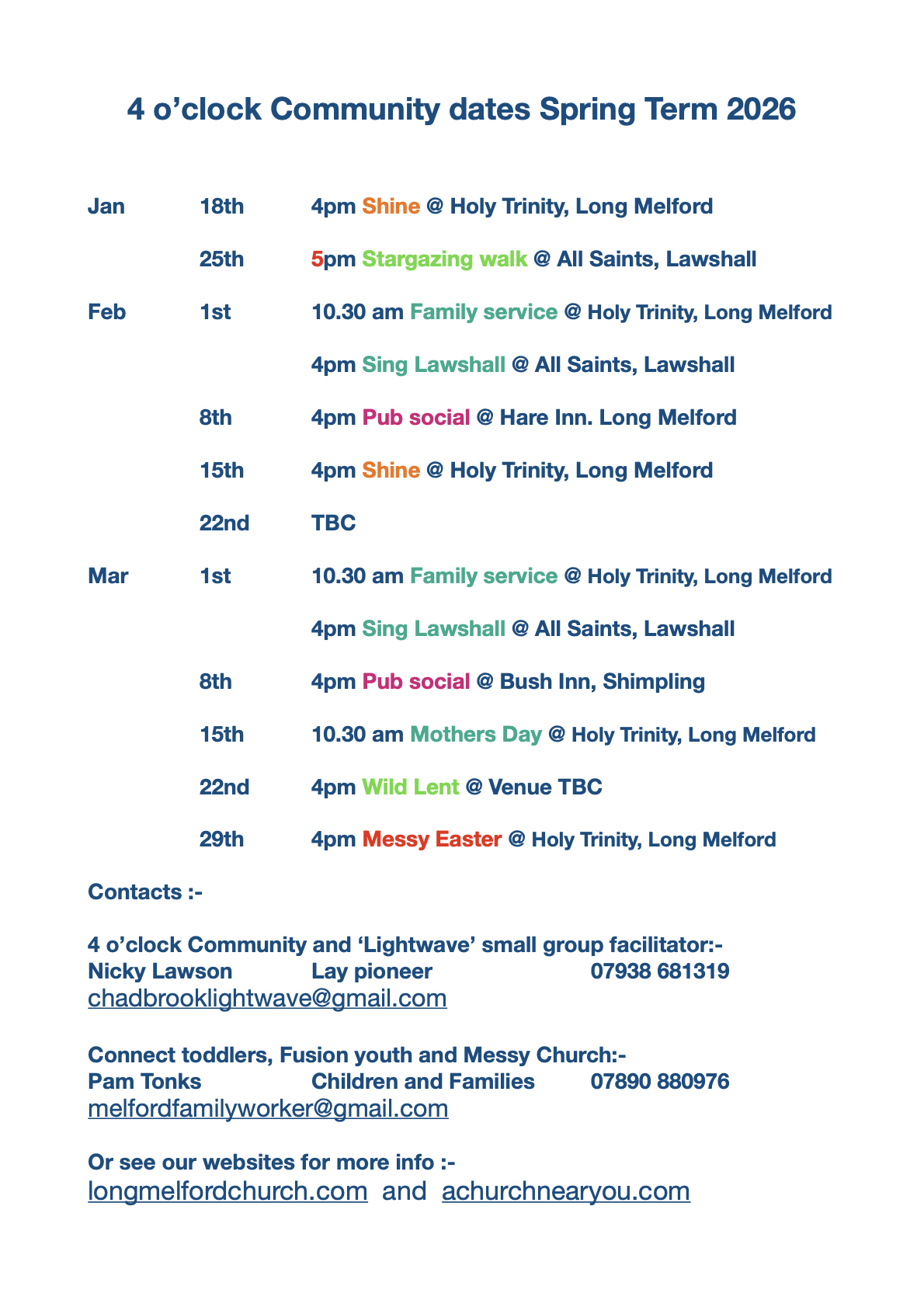 Please see attached our Spring term dates with contact details for Nicky (Lay Pioneer) or Pam (Family and Children's worker).