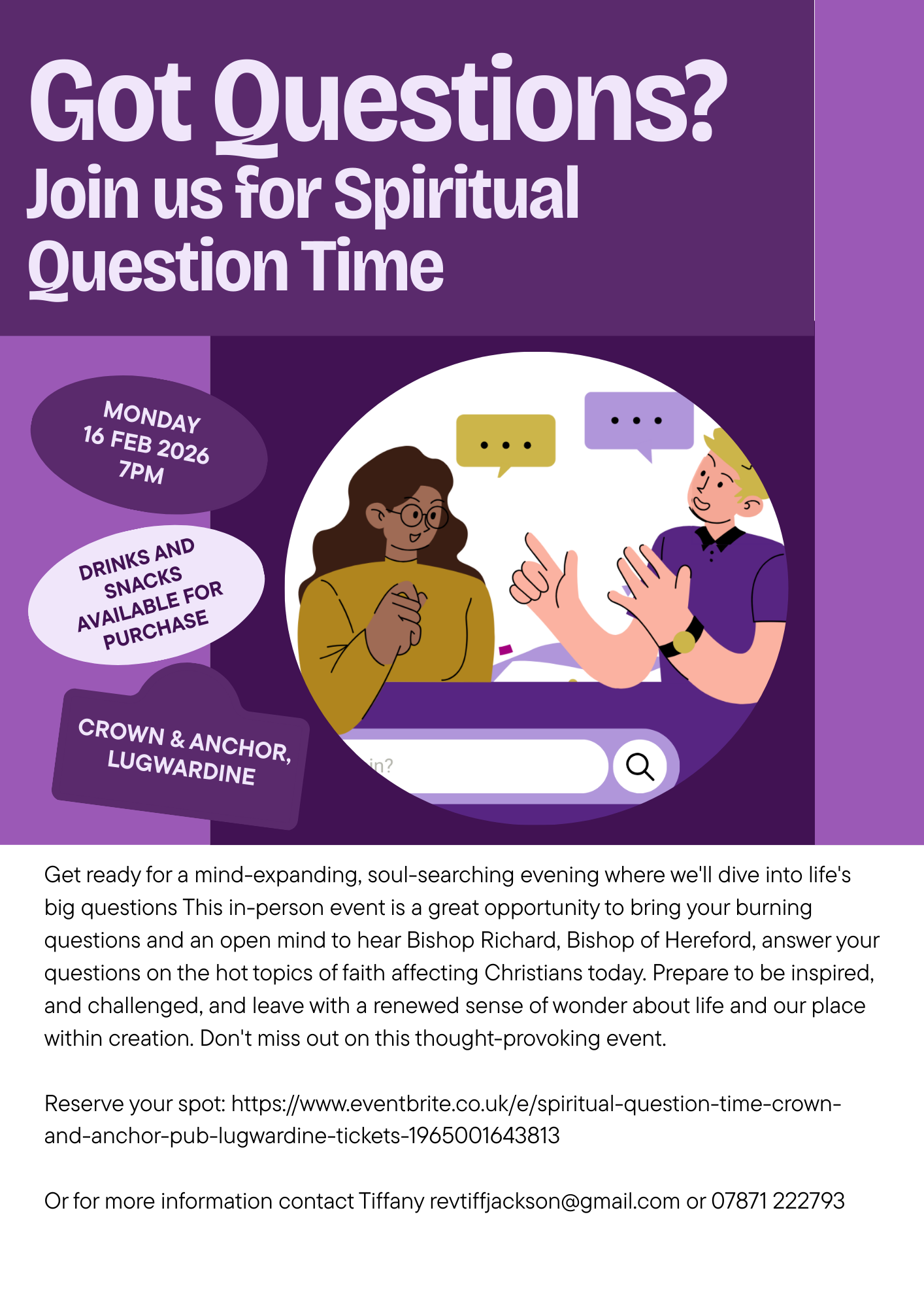 Join us at The Crown and Anchor Lugwardine for a drink and an evening of spiritual questions and answers with Bishop Richard, Bishop of Hereford. This event is a great opportunity for everyone, of all faiths and backgrounds, to anonymously (or not) ask questions of spirituality and faith, around the topics affecting us all today. So bring your burning questions and an open mind to this thought provoking event.