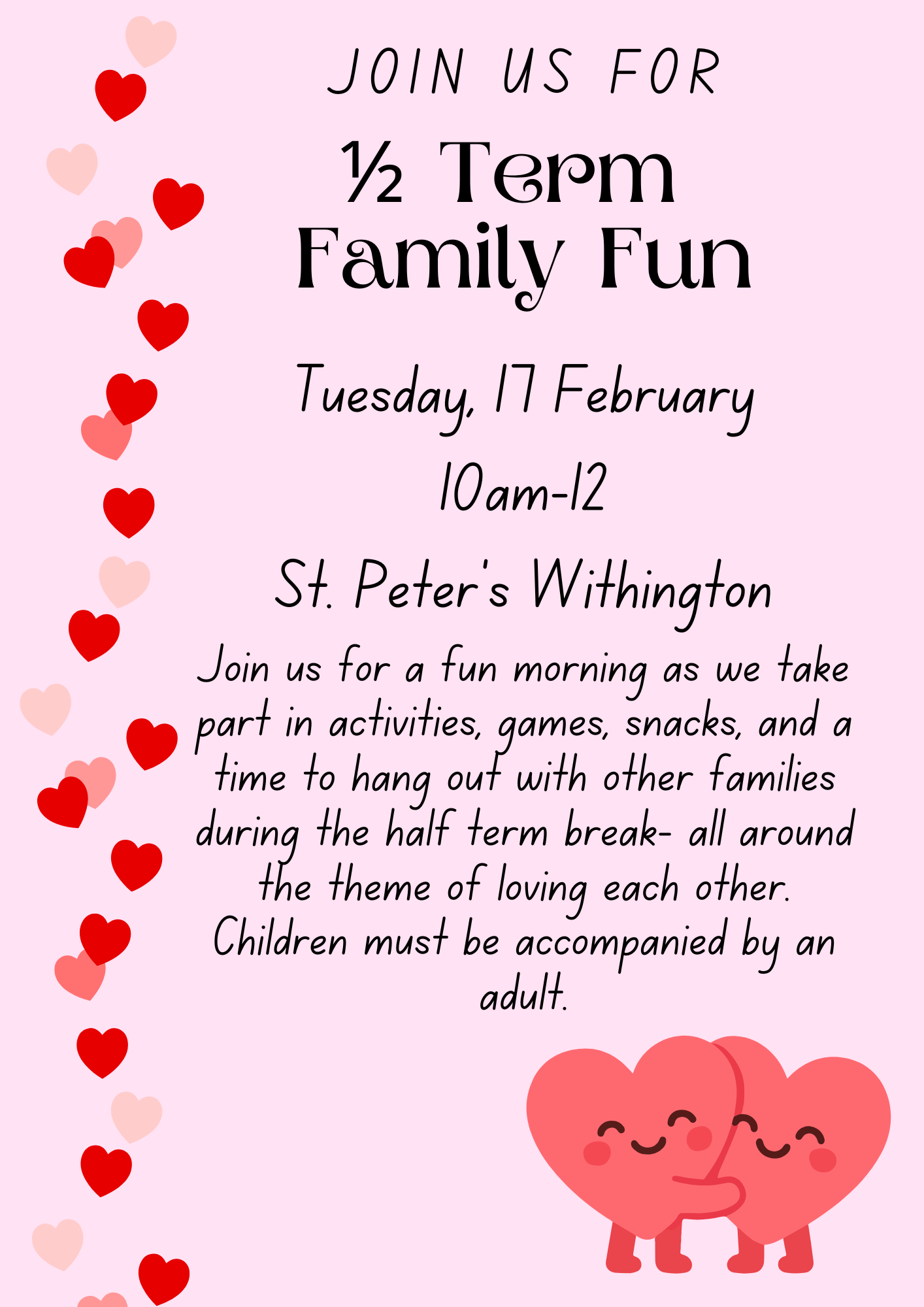 Join us for a fun morning as we take part in activities, games, snacks, and a time to hang out with other families during the half term break- all around the theme of loving each other. Children must be accompanied by an adult.
