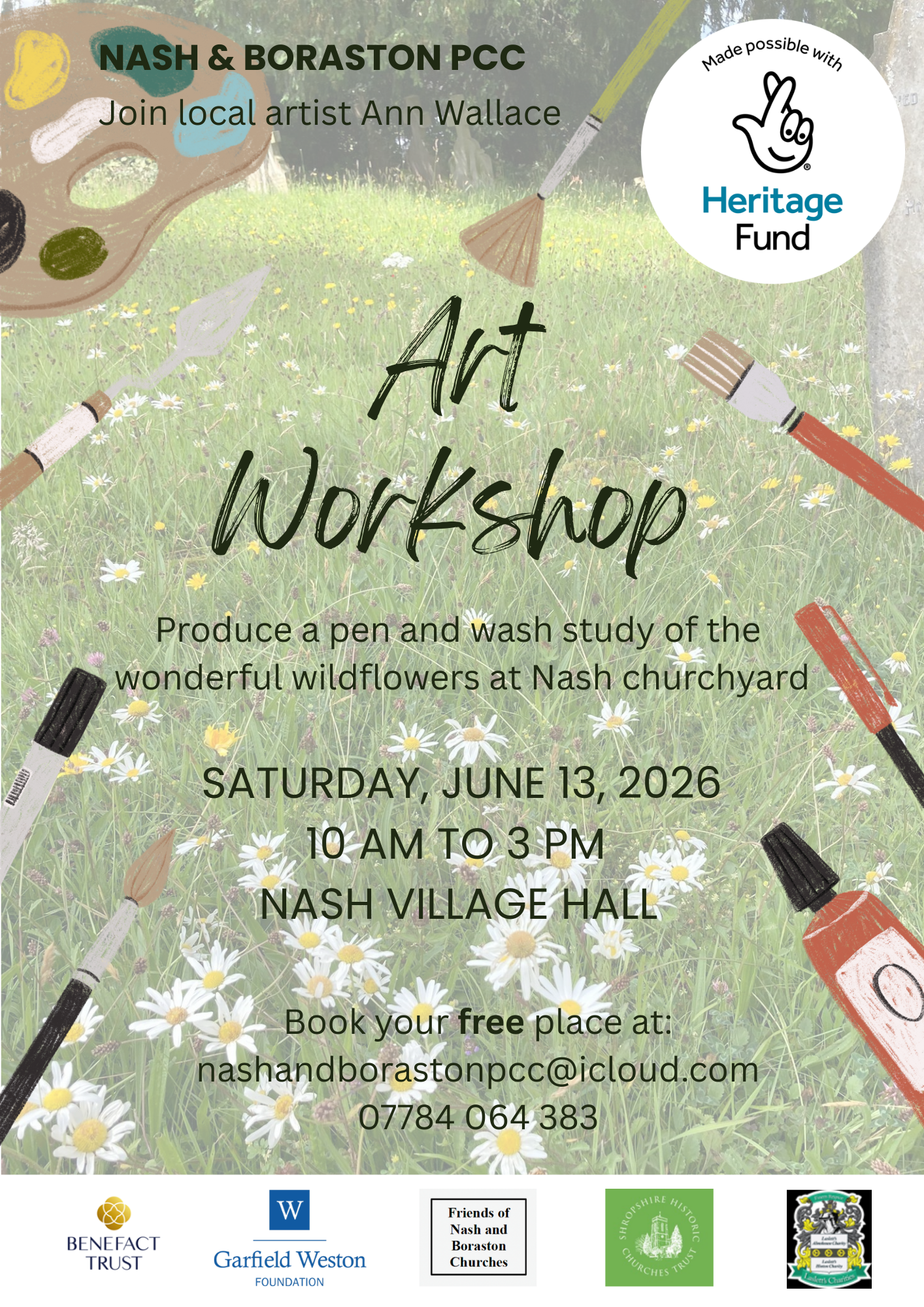 Introducing the first community activity from the National Lottery Heritage Fund project at St John the Baptist, Nash. Join local artist Ann Wallace for a free Art Workshop celebrating the wildflowers in the churchyard. Book your free place by email ([email protected]) or phone / WhatsApp (07784 064383). Places are limited, so early booking is essential.