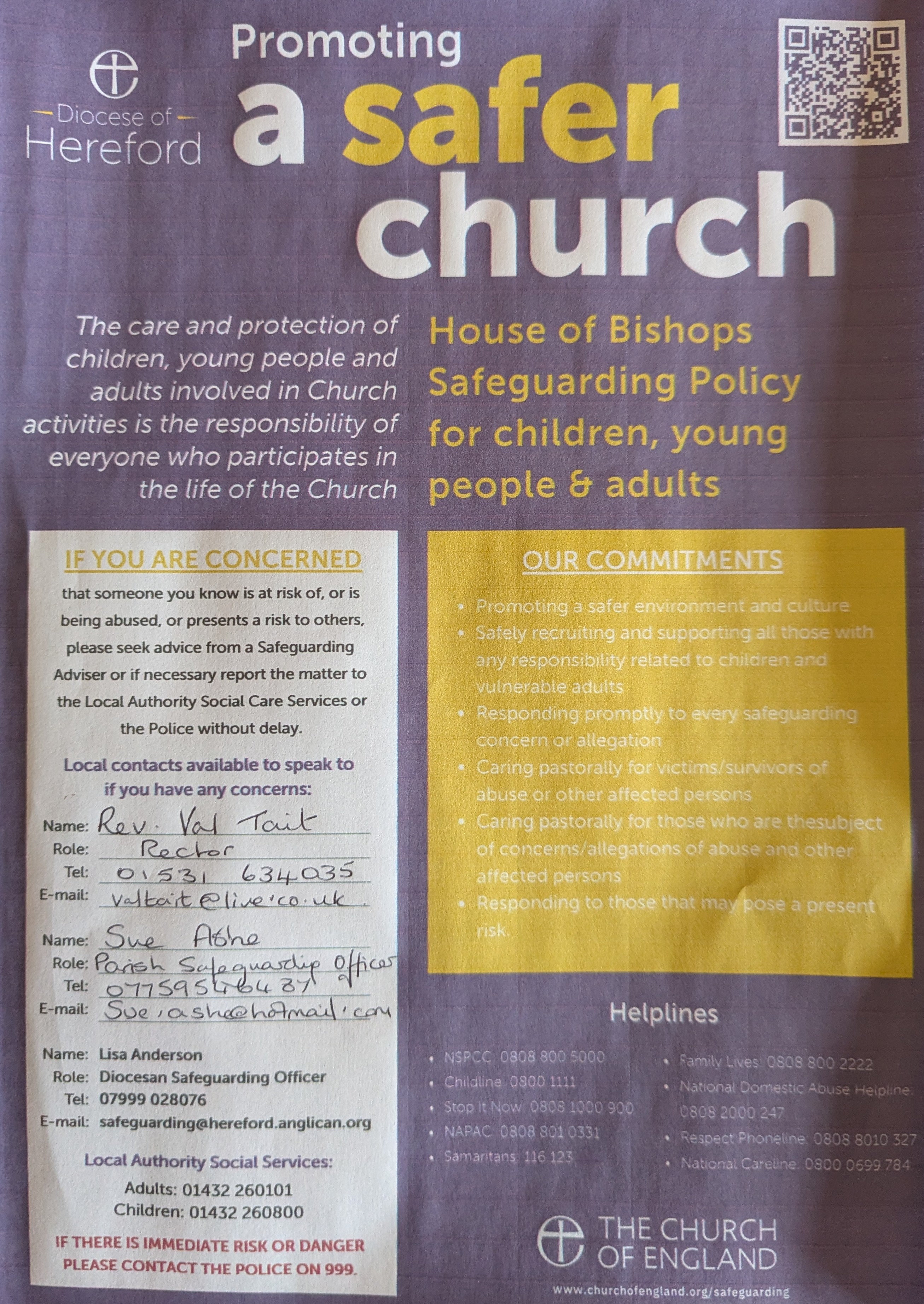 · We have notices showing contact details of Sue and Val inside and outside church;