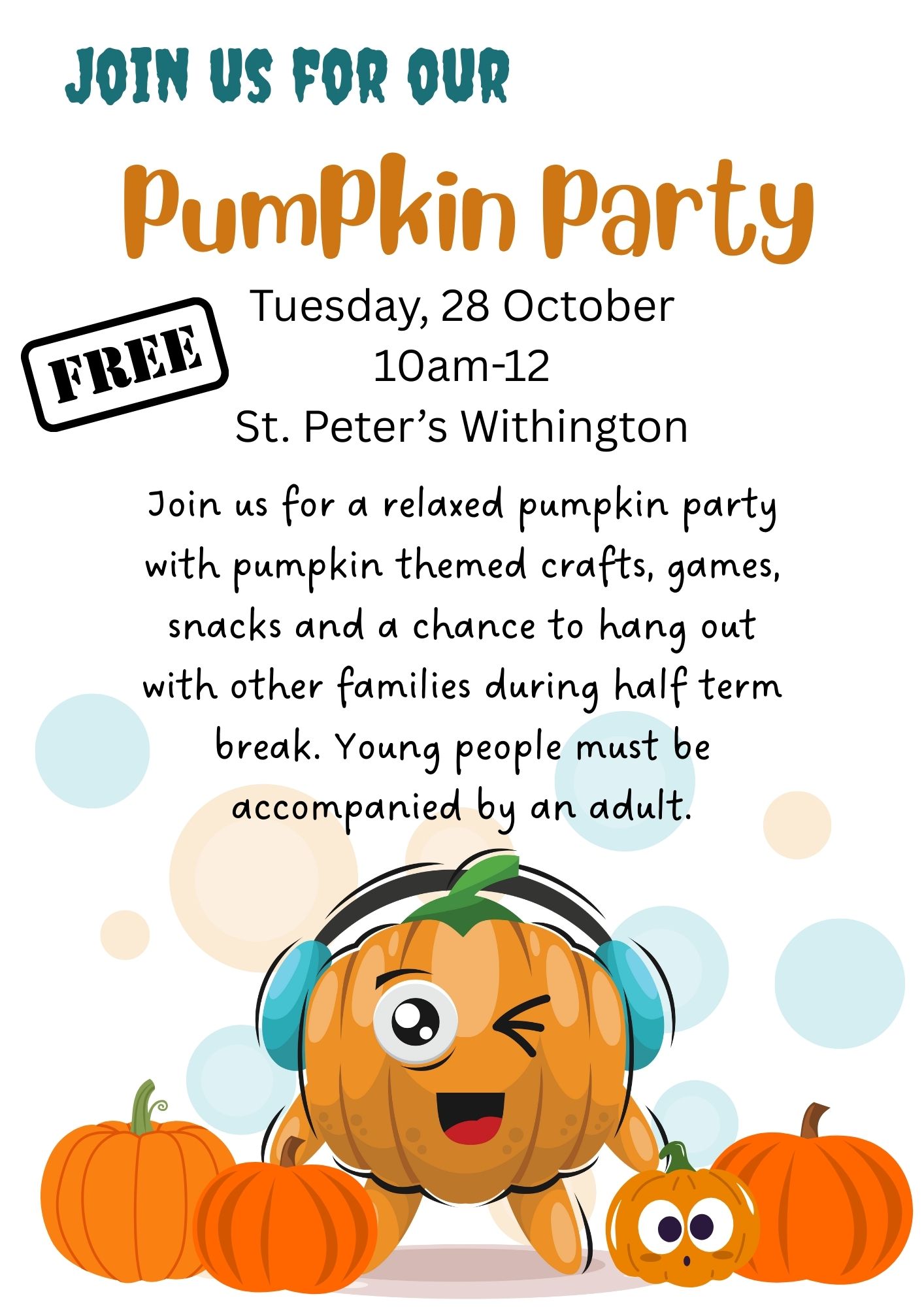 Join us for a relaxed pumpkin party with pumpkin themed crafts, games, snacks and a chance to hang out with other families during half term break. Young people must be accompanied by an adult.