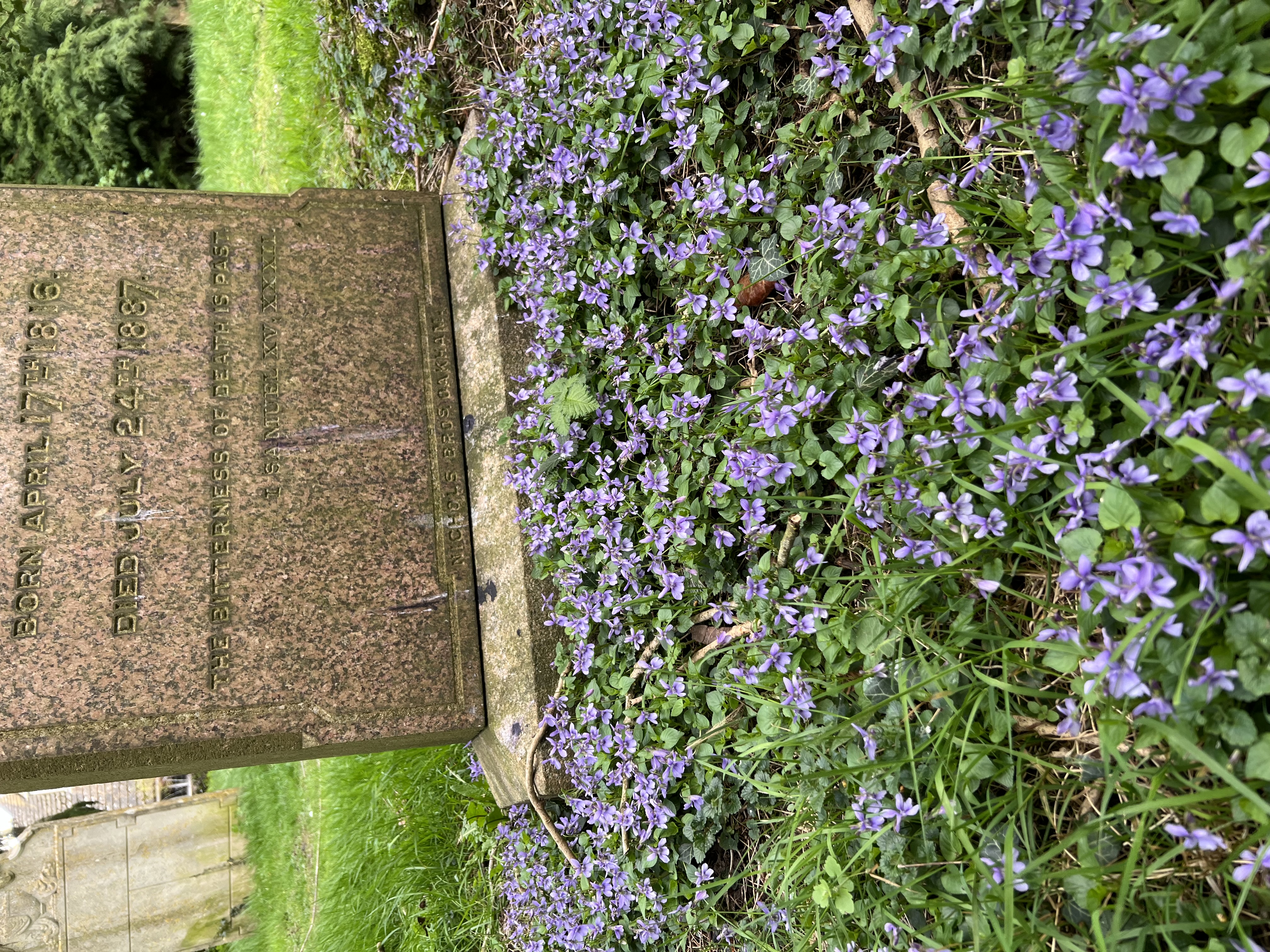There is a lovely patch of violets in full bloom on graves in our church yard. There are five native species of violets and these pale lilac-coloured flowers are a special locally-common native species called Early Dog-Violet which thrive in a shady place. There are only a handful of areas in Rutland where they are recorded to be growing, most of which are in Ancient Woodland and church yards. To identify the species, you have to look around the back of the petals and check the shape of the flower spur, sepals, flower stem and leaves. The Early Dog-Violet has slender straight dark violet-blue spur, not furrowed or notched. The sepals are pointed and the upper part (sepal appendages) are very short.