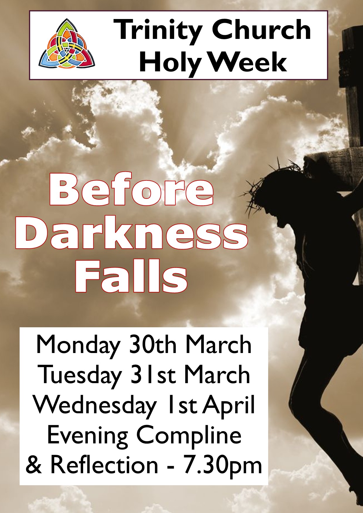 As Holy Week deepens, come and rest in the stillness. ‘Before Darkness Falls’ at Trinity.