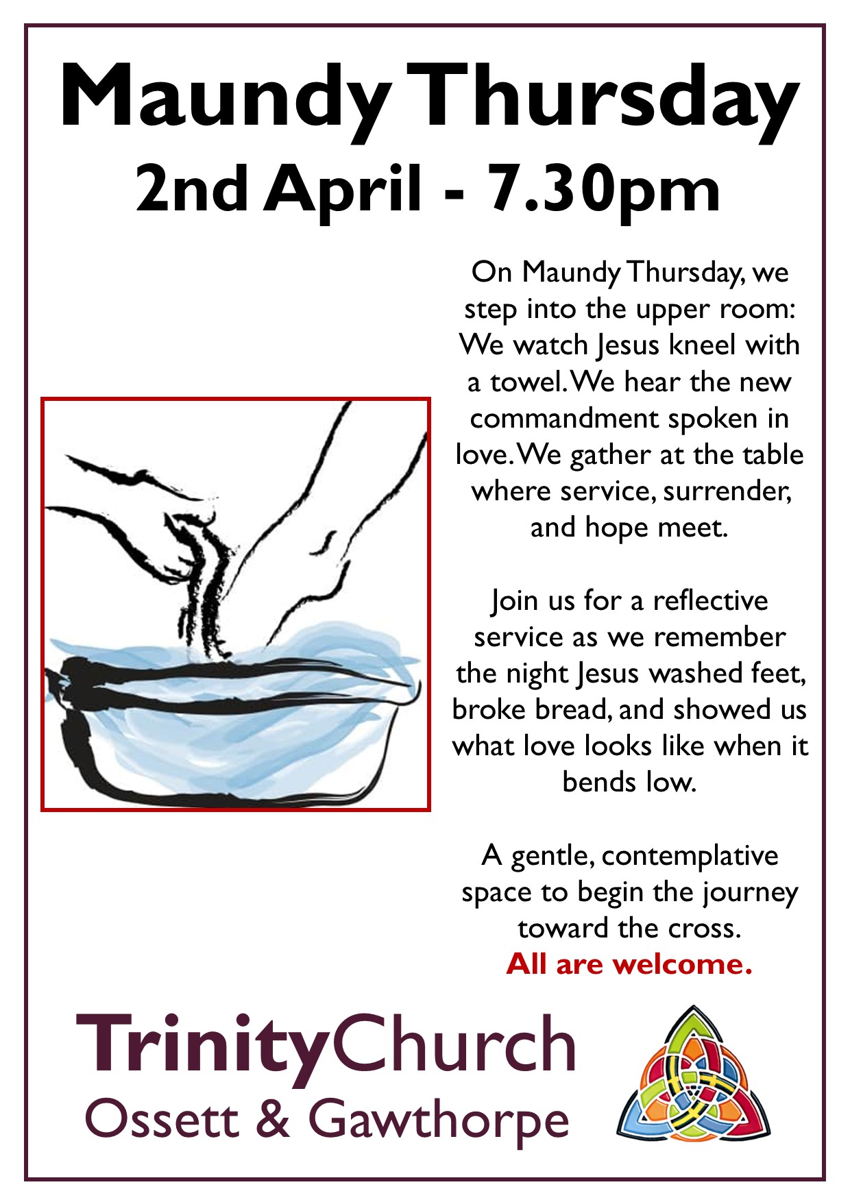 On Maundy Thursday we remember love in action. Eucharist and foot washing at Trinity—come and share the story.