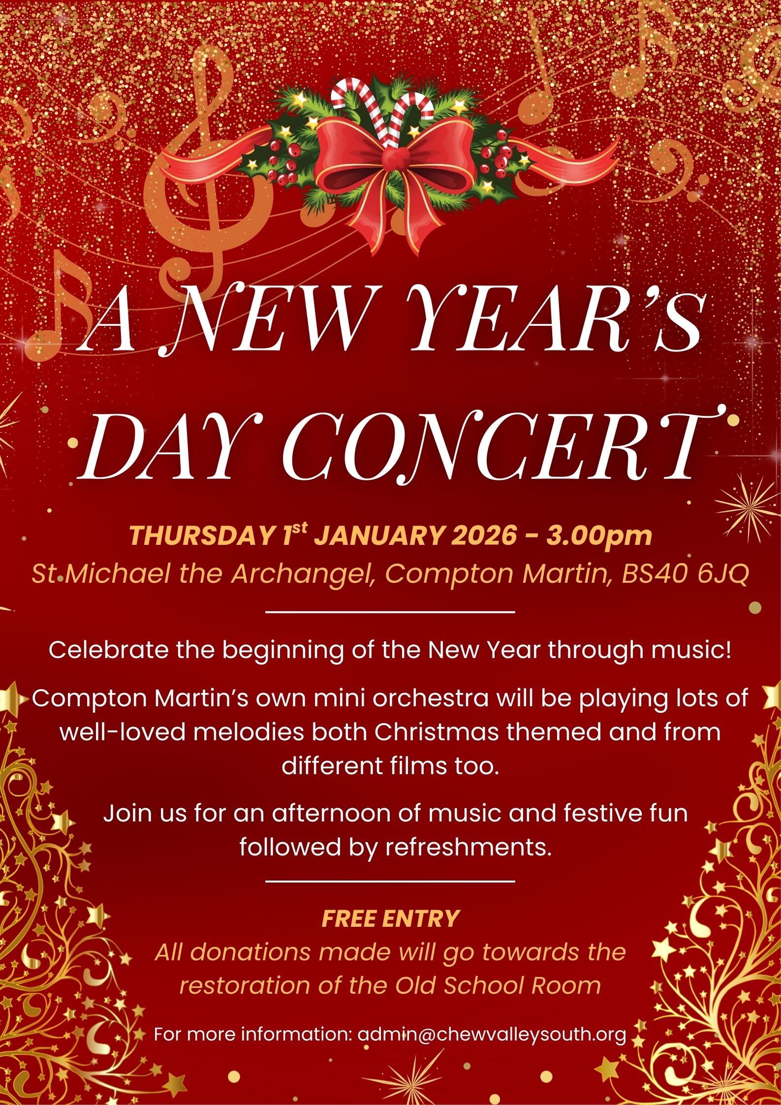 A New Year's Day Concert with Compton Martin's own mini orchestra playing lots of well loved melodies, both Christmassy and from films. Followed by refreshments in the Old School Room.