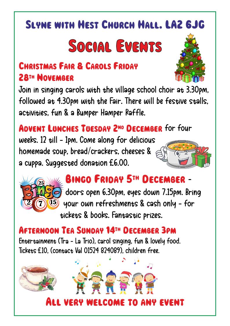 Entertainment (Tra-La Trio), carol singing, fun and lovely food. Tickets £10 (contact Val 01524824089) children free.