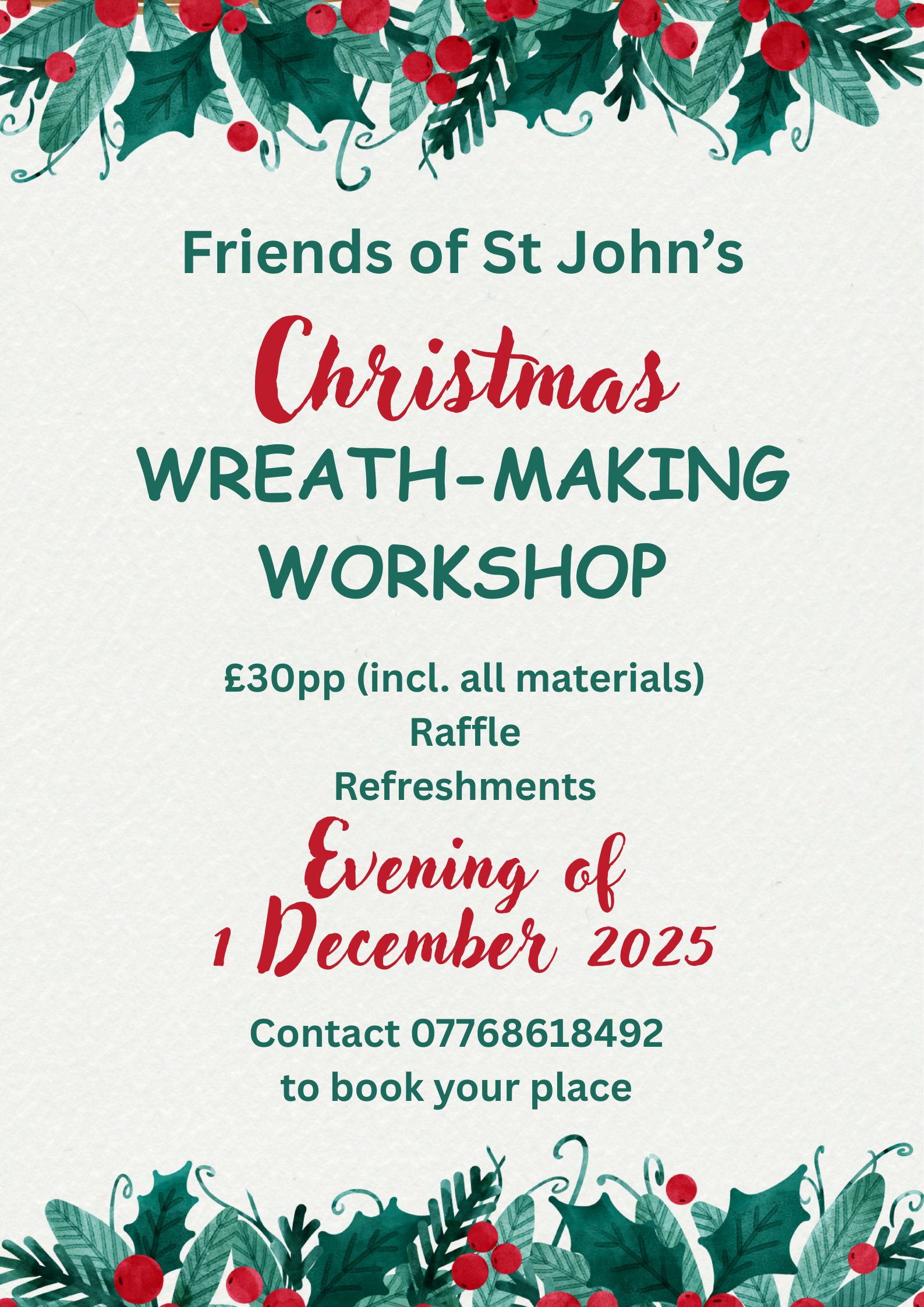 The Friends of Sr John's are holding a Christmas Wreath-making Workshop on the evening of 1 December 2025. If you have fancied making your own wreath, why not join us?! £30pp (including all materials). There will be refreshments and a Raffle (small extra cost). All proceeds will go to St John's Church funds.