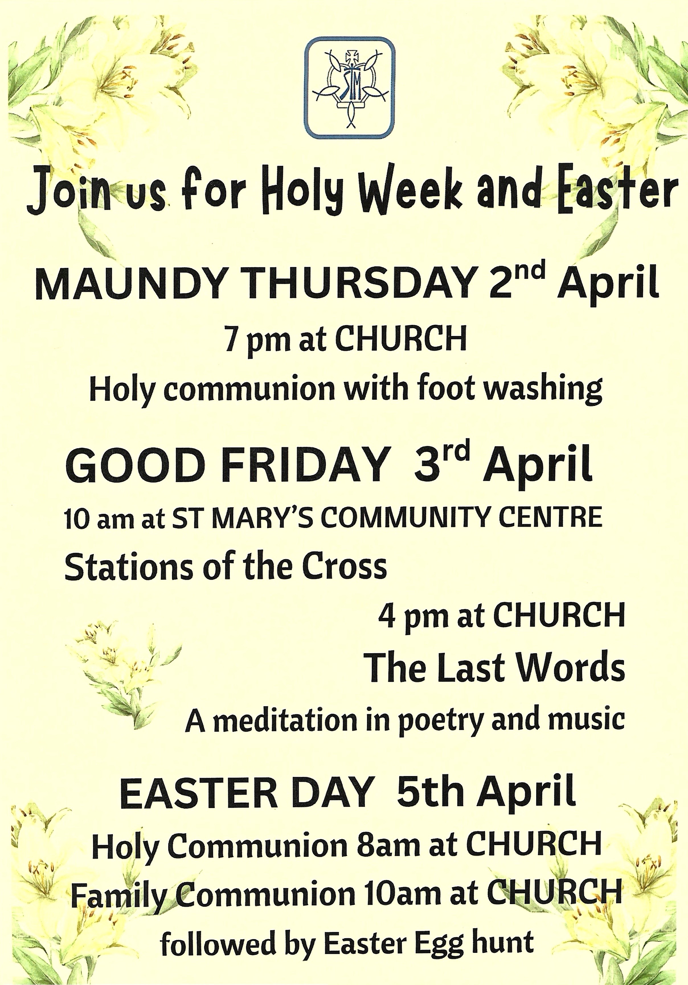 Welcome to Holy Week and the Easter Weekend at St Mary's Kennington. Please see the attached poster for all the details.Everyone is welcome to attend and we look forward to seeing you as we share the Holy Week and Easter Story.