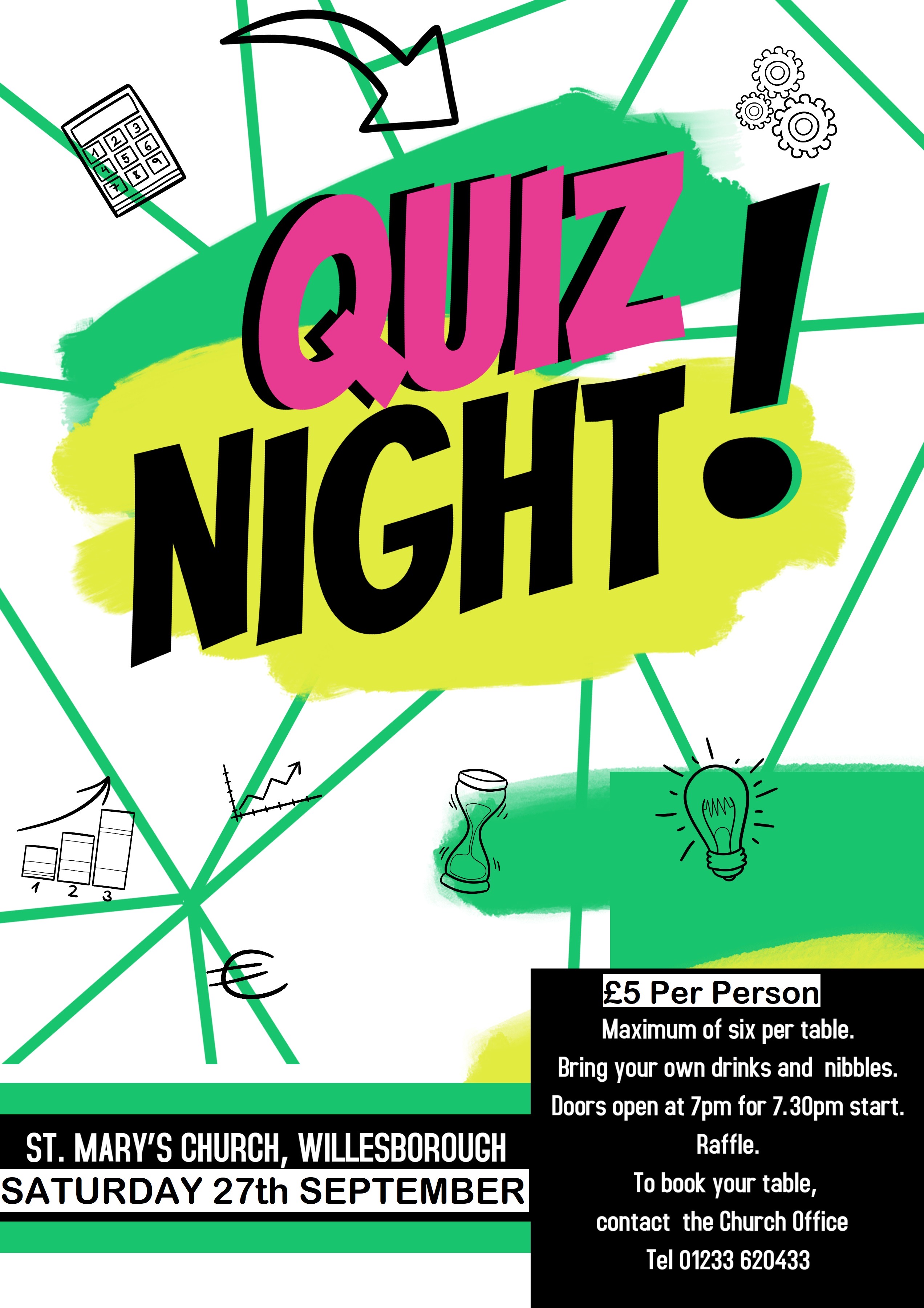 £5 per person. Maximum of six per table. Bring your own drinks and nibbles. Doors open at 7pm for 7,30pm start. Raffle. To book your table, contact the Church Office Tel 01233 620433.