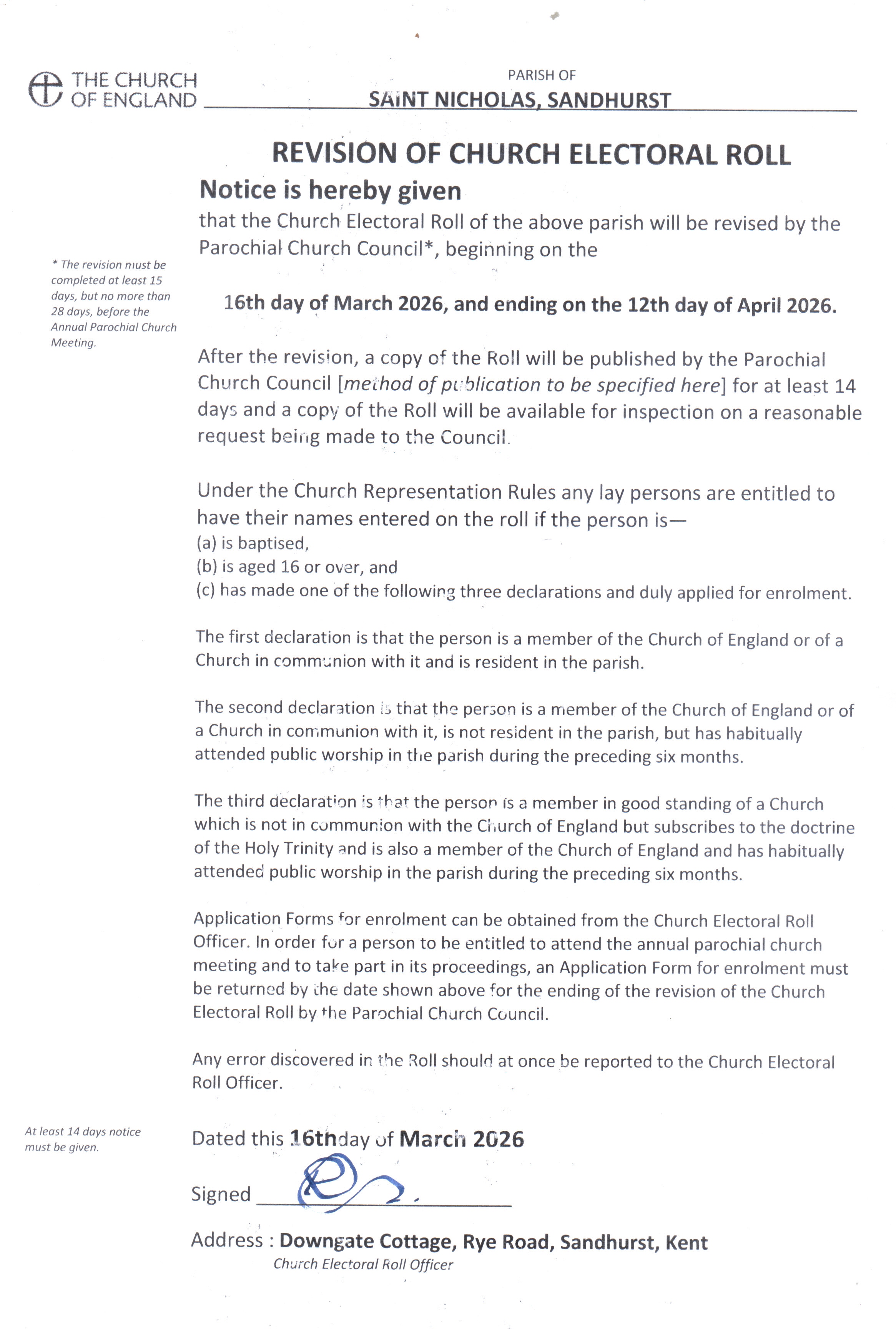 The Electoral Roll for St Nicholas Church, Sandhurst is currently under revision. To join the Electoral Roll please contact Richard Cutchey, Electoral Roll Officer, email [email protected]. The deadline for applications is 12th April 2026.