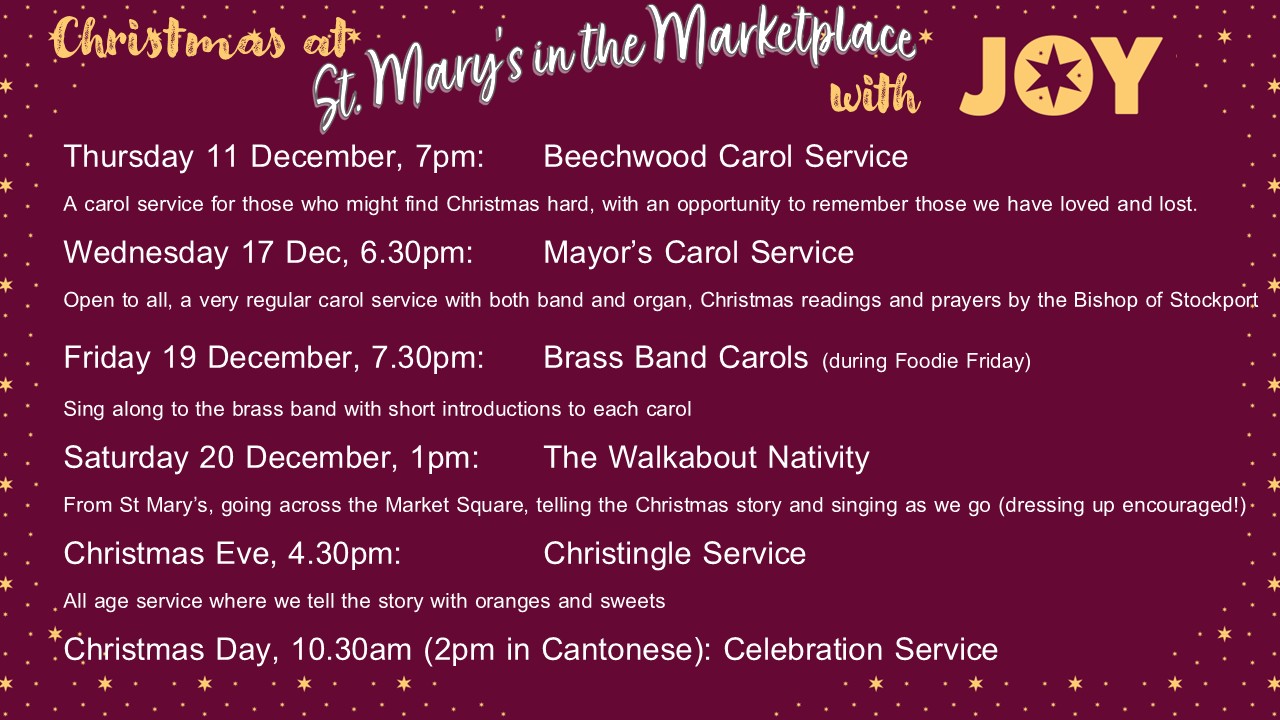 All welcome to all our services.  And note, our regular Tuesday service on 23rd December at 12.15 will be a short carol service as well.