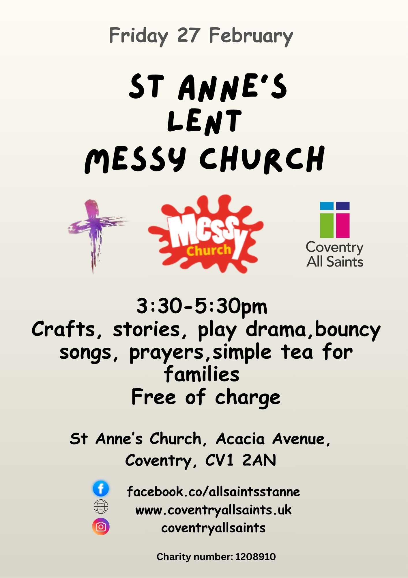 Hi everyone please join us for Lent Messy Church after school 3.30-5.30pm on Friday 27 February at St Anne's CV1 2AN for crafts activities fun songs story prayers and a lovely nourishing tea meal for all the family!