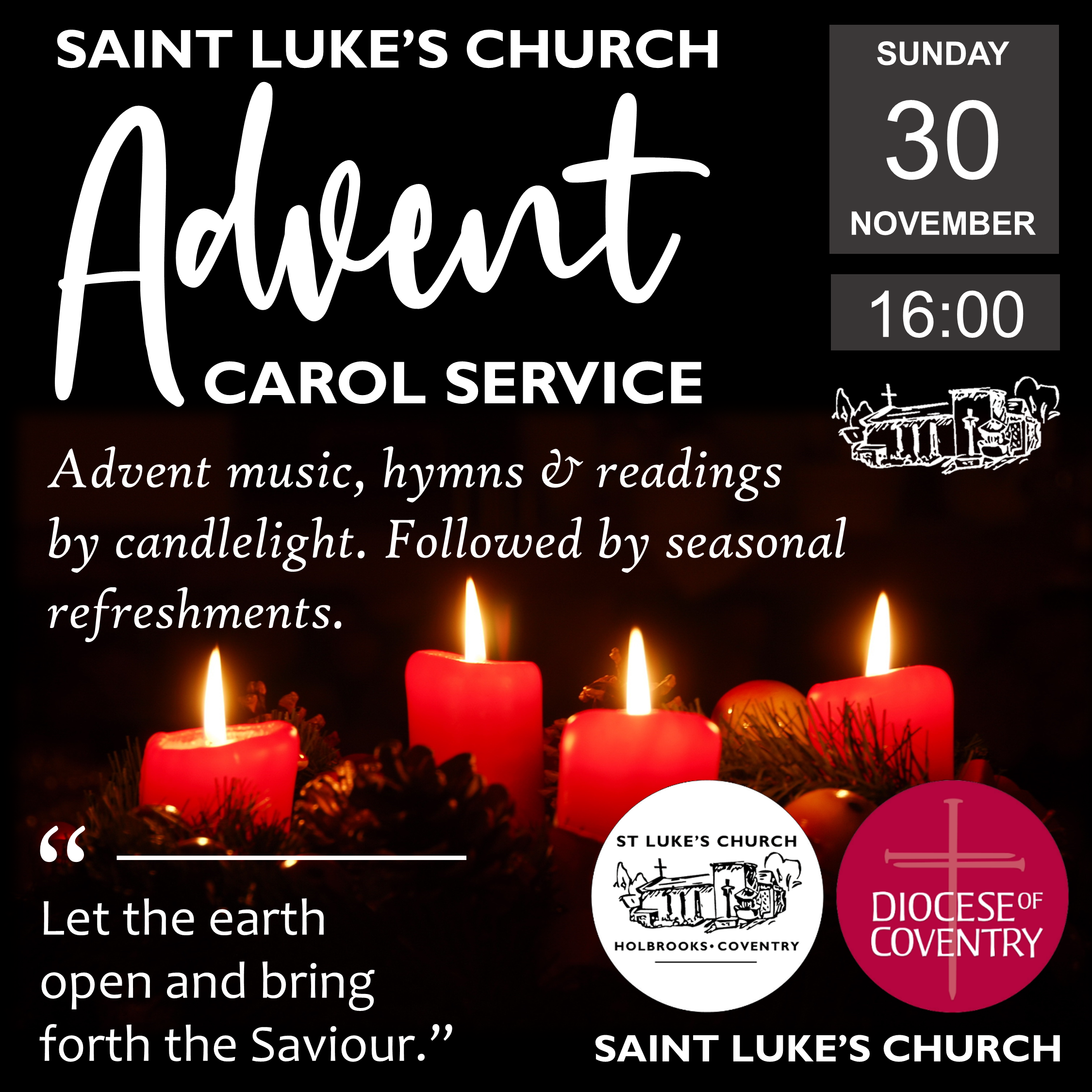 Advent music, hymns & readings by candlelight, with short reflections from the Bishop of Coventry. Followed by seasonal refreshments.