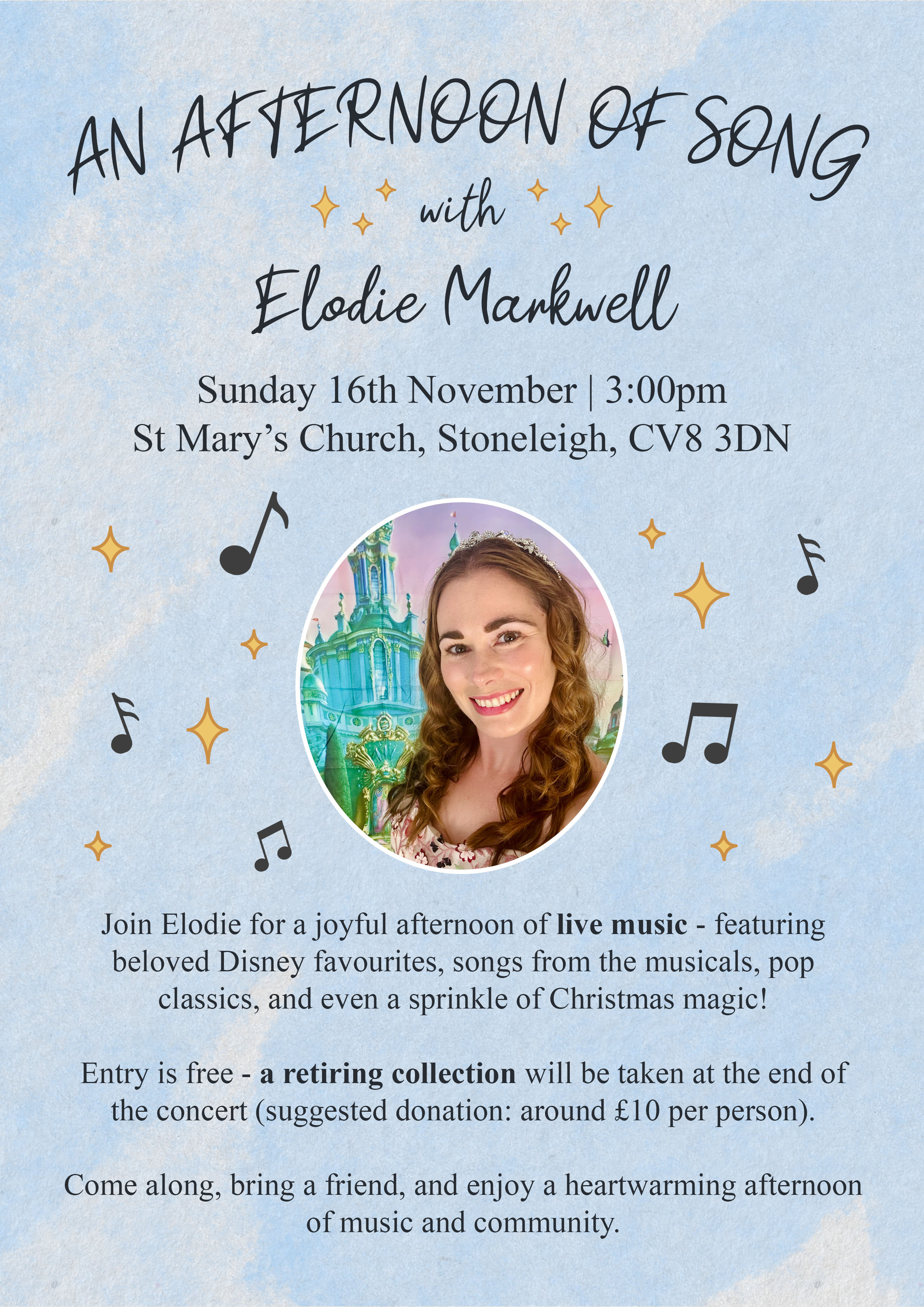 On Sunday 16th November at 3.00 pm at St Mary’s Church, Stoneleigh. Join Elodie for a joyful afternoon of live music—featuring beloved Disney favourites, songs from the musical, pop classics, and even a sprinkle of Christmas magic!
