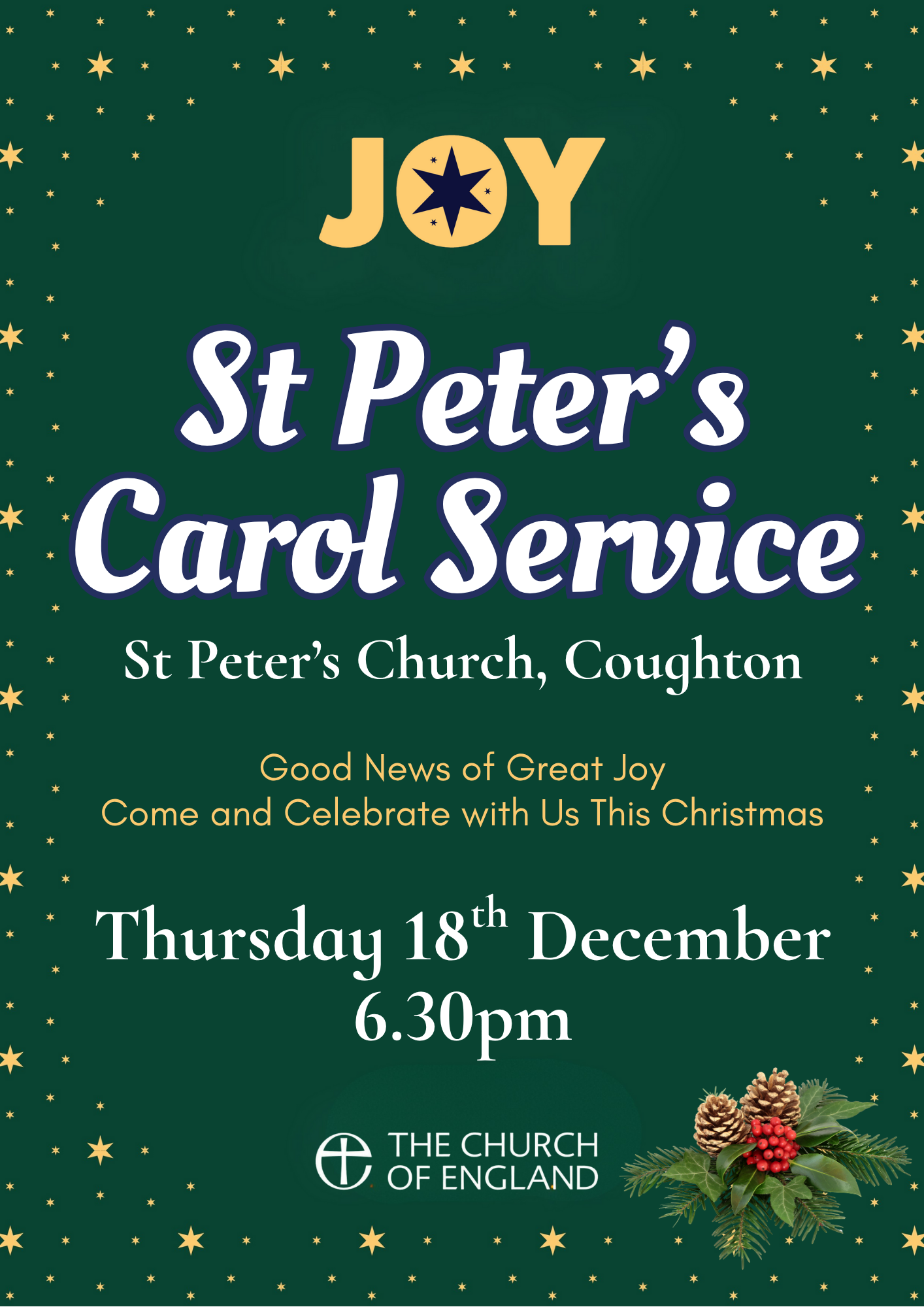 Join us at St Peter's for our Carol Service and get in the Spirit of Christmas cheer and goodwill with songs everyone knows, the more the merrier!