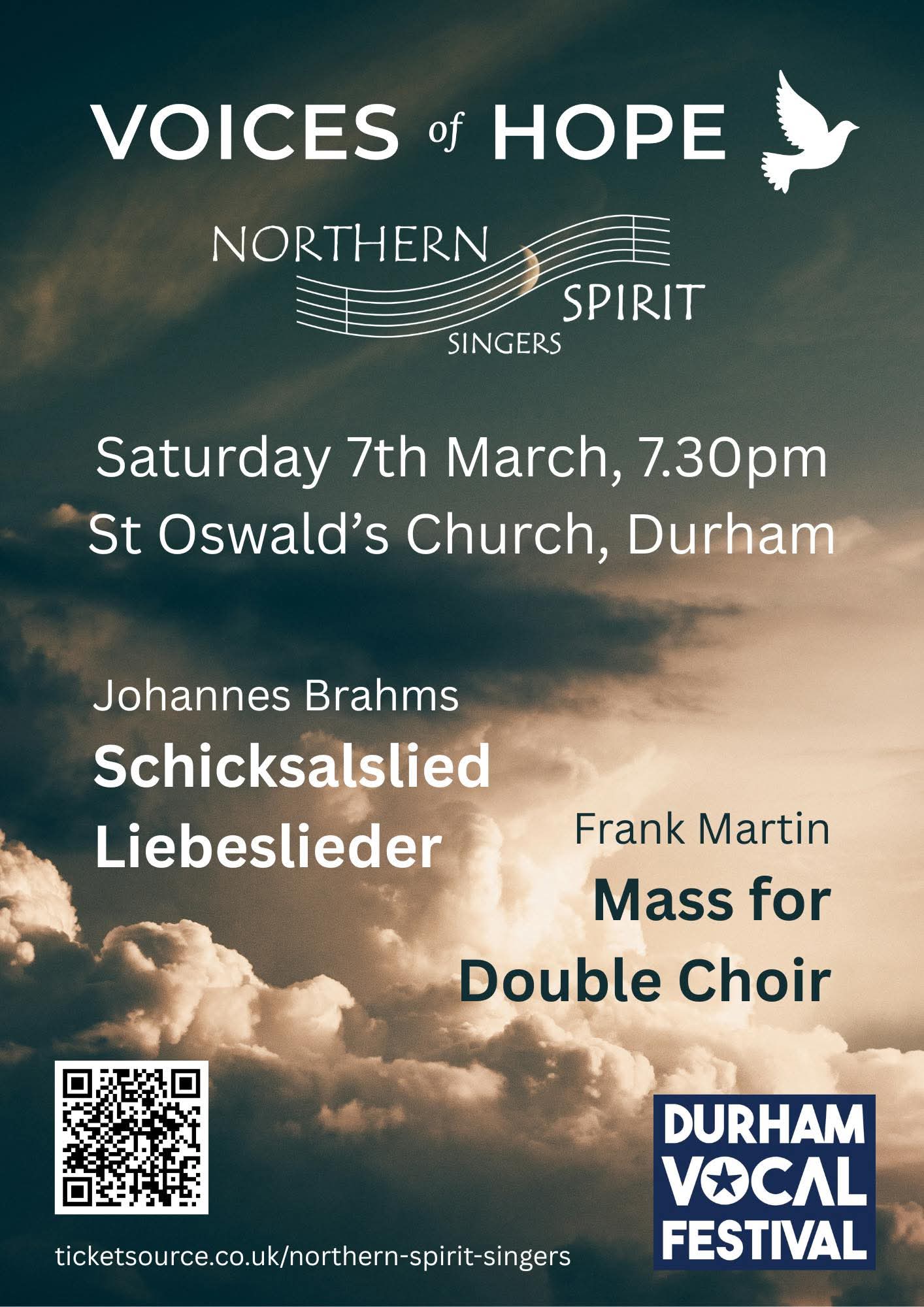As part of Durham Vocal Festival 2026, Voices of Hope are collaborating with Northern Spirit Singers to perform Johannes Brahms: Schicksalslied and Liebeslieder and Frank Martin: Mass for Double Choir.