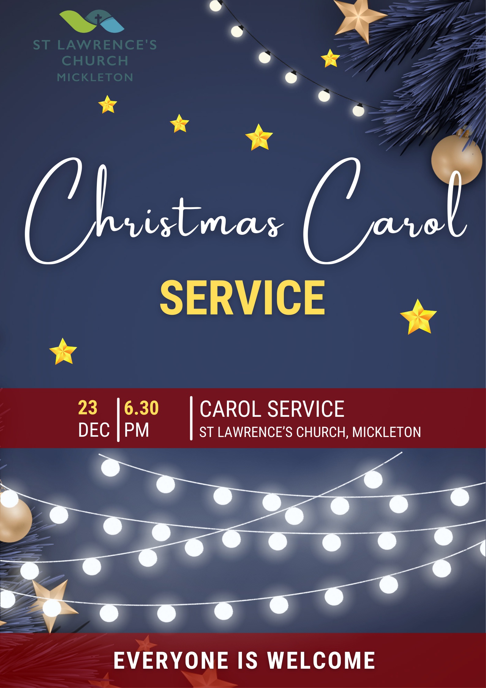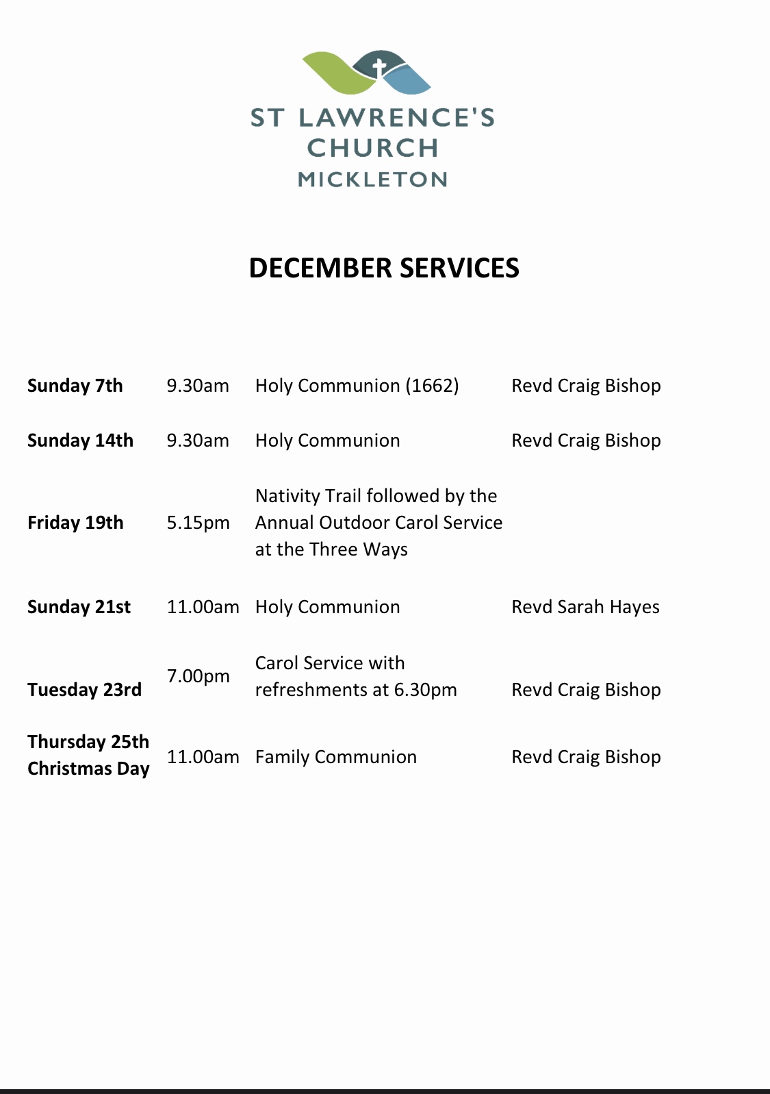 December 23rdAll are welcome at our Christmas Services.Please note our Carol service time:6:30 refreshments, 7:00 start of the service.