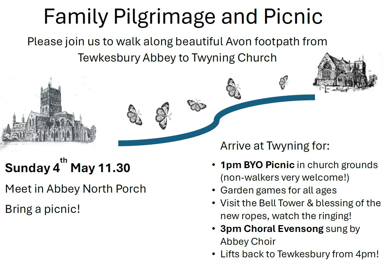 The Sunday Choir of Tewkesbury Abbey will be walking up to Twyning and you are most welcome to join them, leaving from Tewkesbury Abbey at 11.30am. This will be followed by a bring-your-own picnic at Twyning Church, the opening of the Bell Tower for visits at 1.30pm and a Service of Evensong in Twyning Church at 3pm