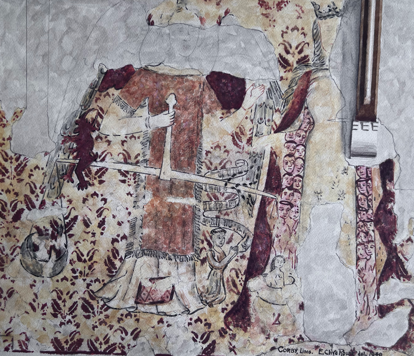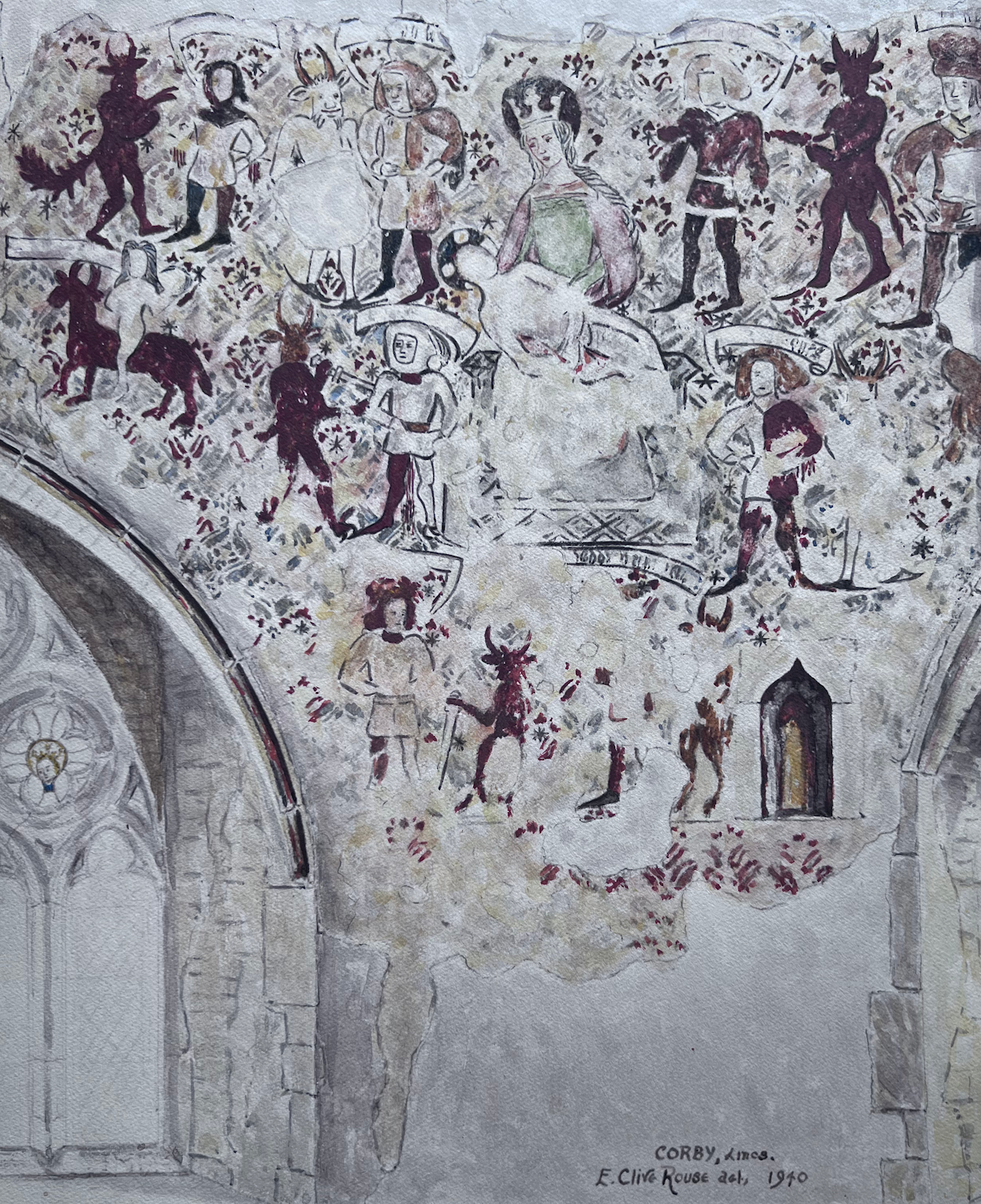The aisle was built as a Lady chapel before 1319 by Dame Margery de Crioll, for her will, at Lincoln, bearing that date, leaves bequests to the Priests “… in the chapel of Our Lady which I have built in Corby Church”. A scheme of mural painting evidently accompanied this work and two subjects remain.