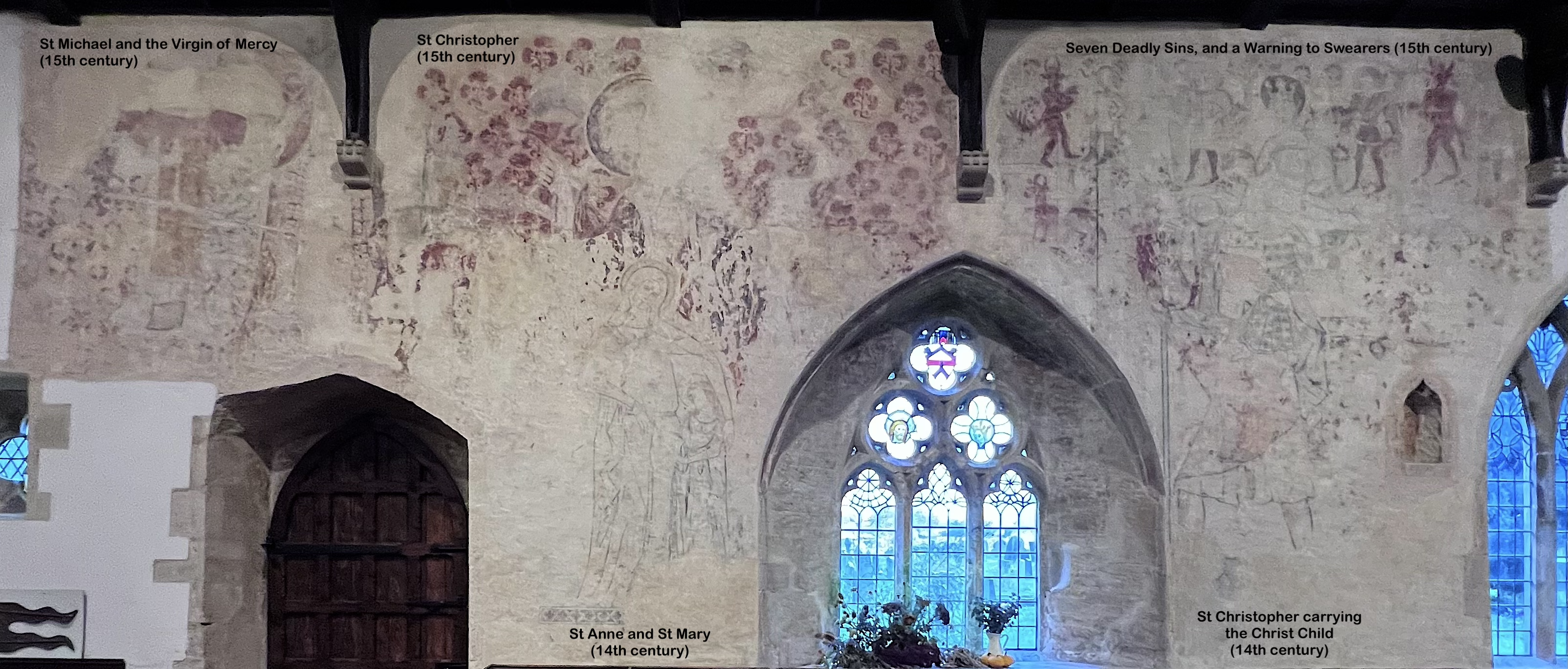 East of the first window are the remains of a second early subject now much confused by lying partly beneath a later painting which could not be removed on account of its interest. It is an enormous representation of St Christopher carrying the Holy Child, in its usual position opposite the main (south) entrance. The rebuilding of the upper part of the wall has destroyed the heads of both the Saint and of the Christ, and the base was damaged by the insertion of a mural tablet (now moved elsewhere) and the failure of the plaster due to damp. However, the painting exhibits several remarkable features.