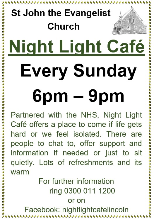 Night Light Cafe Every Sunday 6pm - 9pm. Partnered with the NHS. For further information ring 0300 011 1200