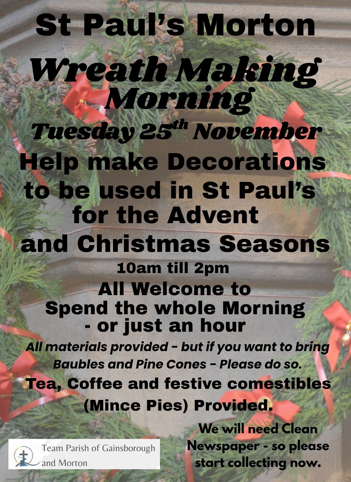 St Paul's Church, Morton invites you to join them for a morning of wreath and garland making on Tuesday 25th November from 10am to 2pm. The wreaths and garlands made will be sued to decorate the church during the festive season. All materials are supplied and you can stay for the whole event or just pop along for an hour. This event is free of charge and refreshments and mince pies will be available. Everyone is welcome and we look forward to seeing you.