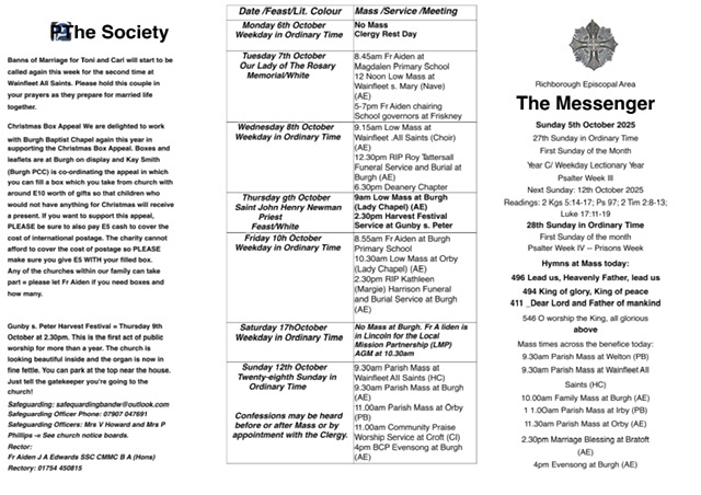 Mass and Service times for W/C Sun 5th October 2025