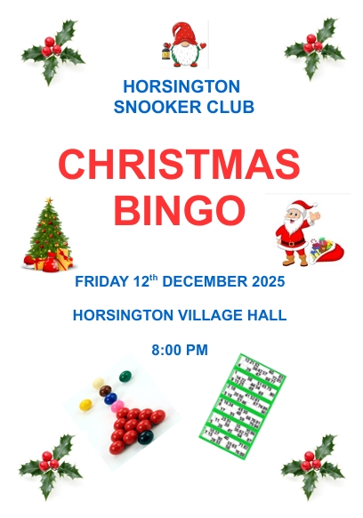 It's that time again! Everyone is welcome to attend the annual Horsington Snooker Club Christmas Bingo, held in the Charles Hill Community Hall! More information to follow.