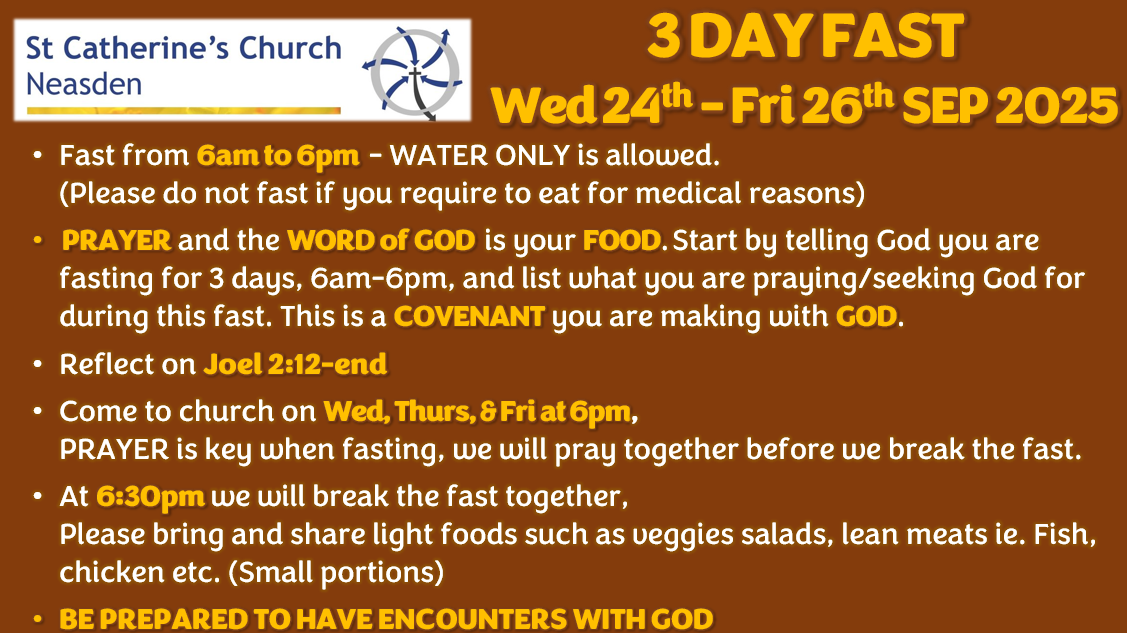 Join us as we FAST & PRAY over 3 days, to humble our souls to awaken our spiritual awareness, increasing our discernment of the Holy Spirit.