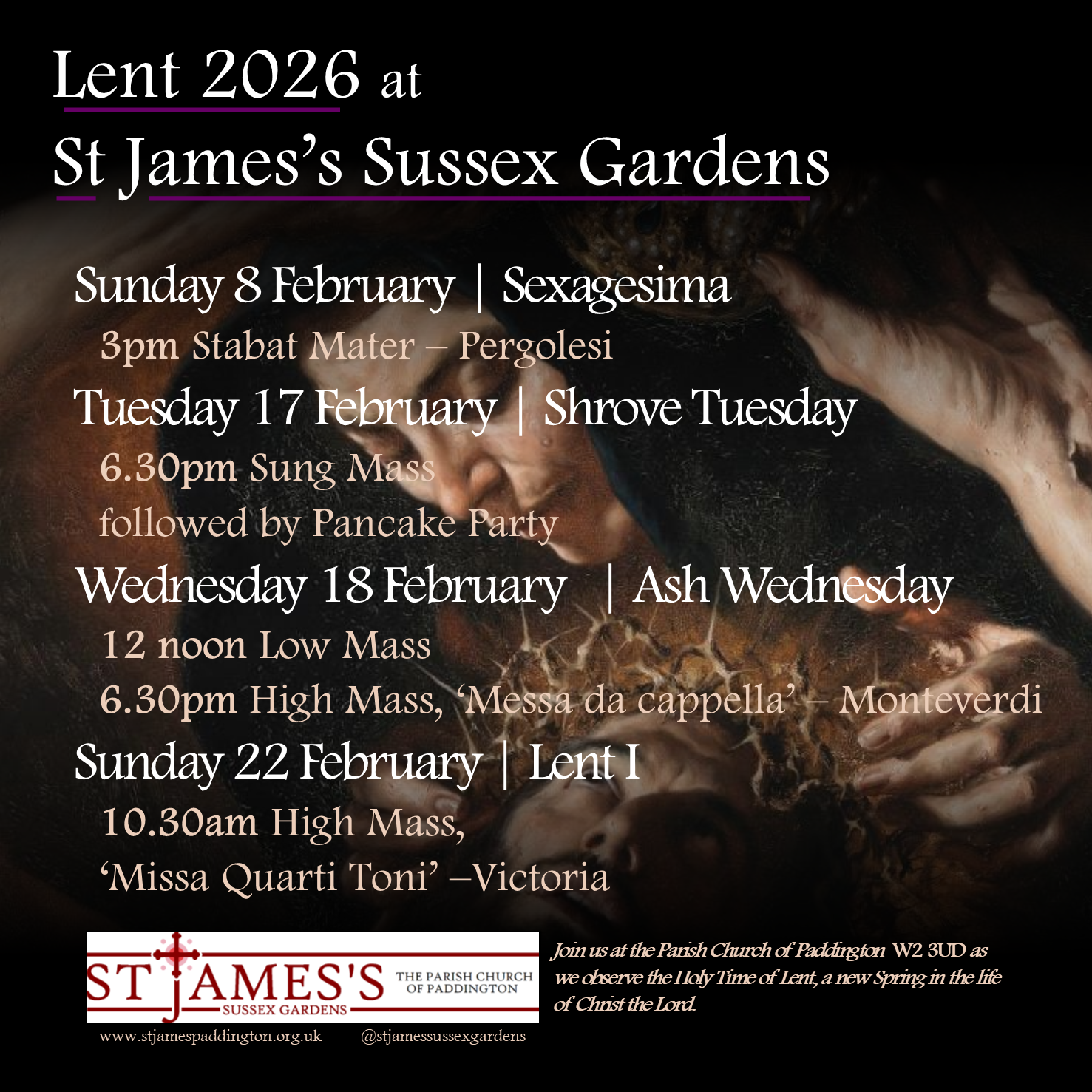 St James's offers a said mass at 12 noon and a Solemn Mass with professional choir at 6.30pm. Ashes are imposed at each service.