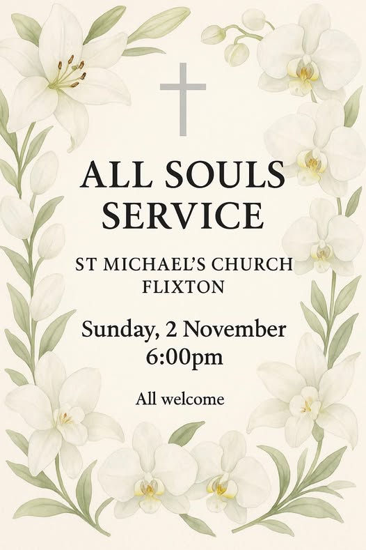 You are warmly invited to join us at St Michael’s Church, Flixton on Sunday, 2nd November at 6:00pm for our All Souls Service, a quiet and reflective time to remember loved ones who have died and where we prayerfully remember those who have departed. The service offers space for prayer, music, and candlelight as we give thanks for those who have touched our lives and now rest in God’s care. All are welcome to come and share in this moment of remembrance and peace.