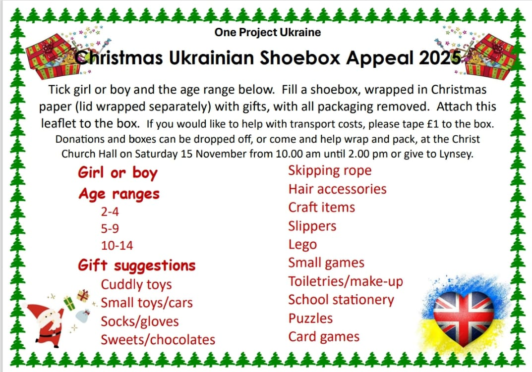 Come and join us to wrap and pack shoeboxes for children in Ukraine or just drop off empty boxes, wrapping paper or gifts - Sat 15th November, 10am - 2pm. Christ Church Healey, Community Hall.