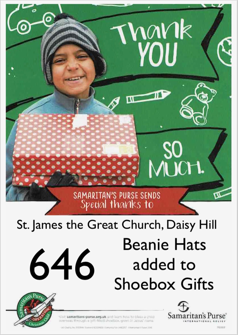 Please click on DOWNLOAD to the right to see the special thank you poster sent to St James’ Daisy Hill and scroll down to reveal the wonderful number of hats our faithful knitters donated in 2025.