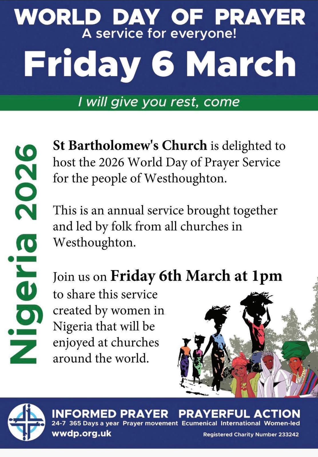 Join us at St Bartholomew's Church, Westhoughton on Friday 6th March at 1.00pm for the World Day of Prayer. This is the annual service brought together and led by people from all churches in Westhoughton.
