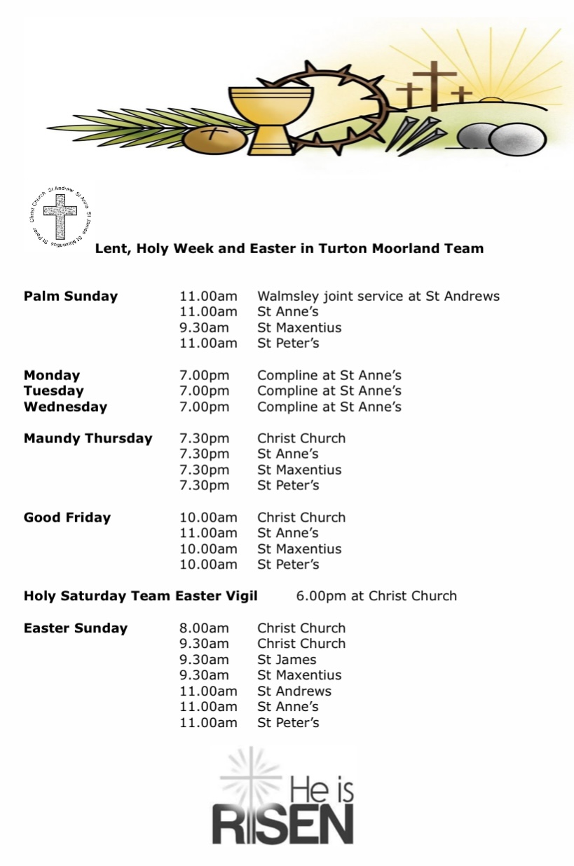 A full list of the services taking place over Easter at all churches in the Turton Moorland Team.  Click the link to download the poster.