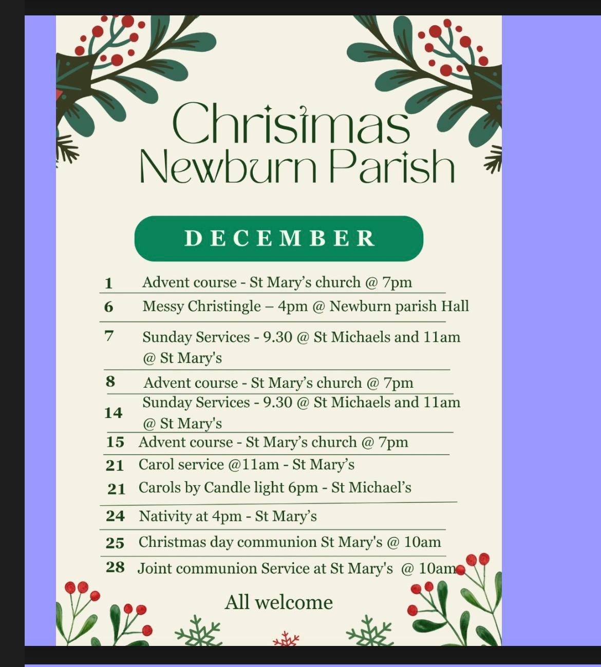 A list of events and services over December and Christmas