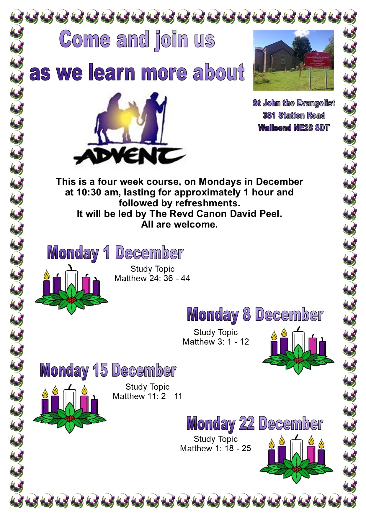 First four Mondays in December starting at 1030am in Church. Lasts an hour followed by refreshments. Led by Revd Canon David Peel