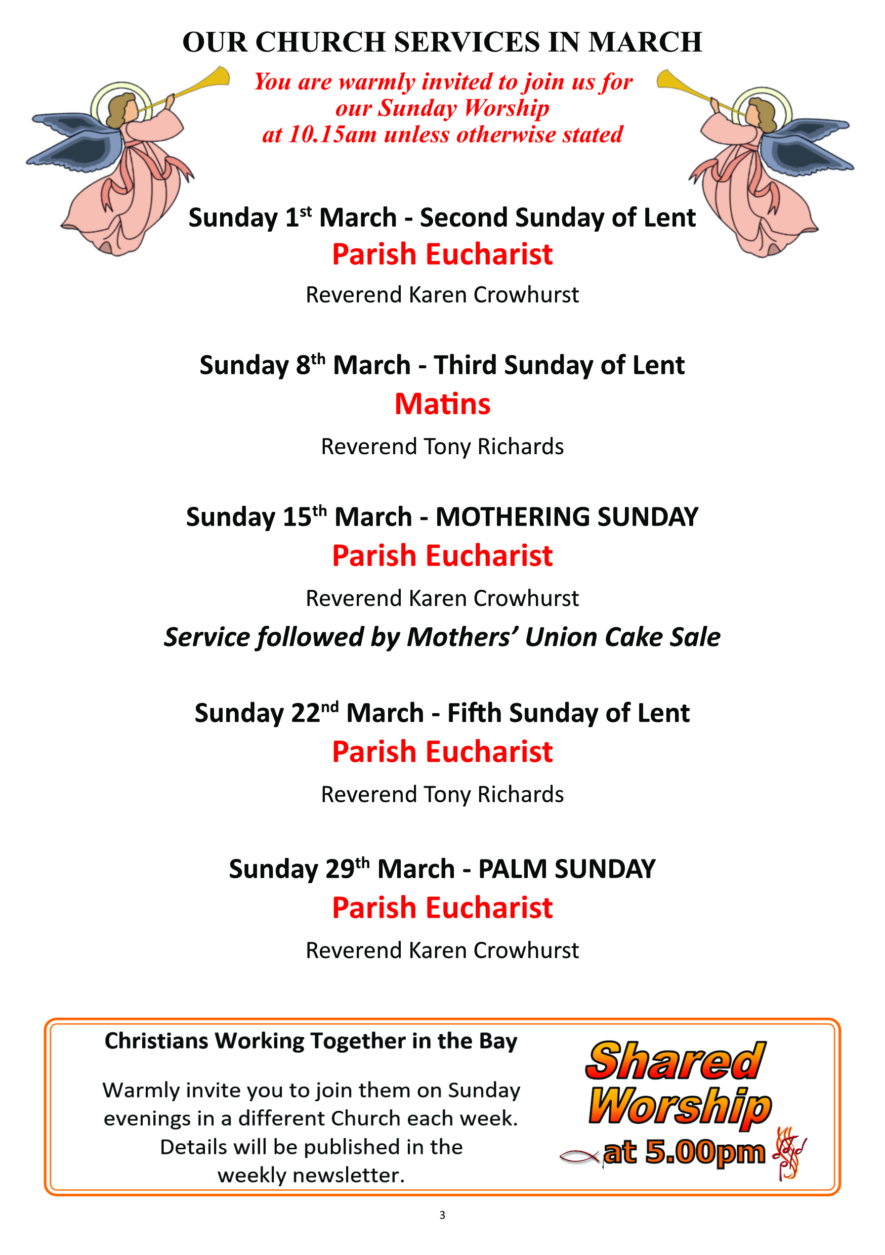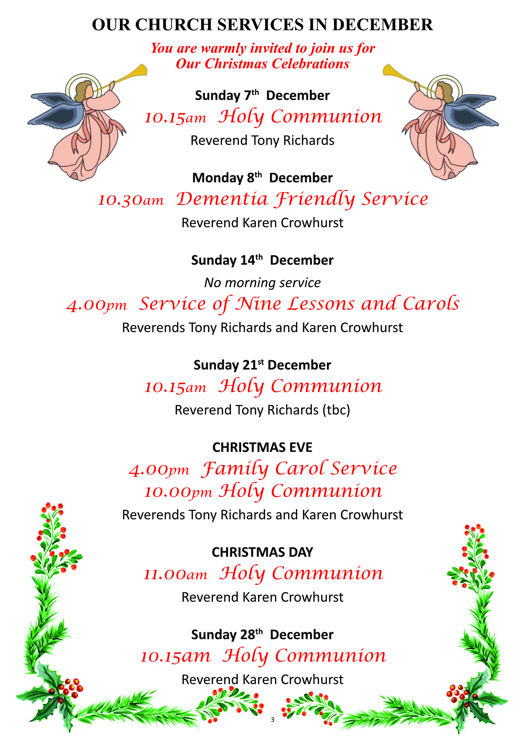 A traditional service of Holy Communion, with hymns, readings, prayers and Sermon. Held every Sunday, with the exception of the second Sunday of each month.