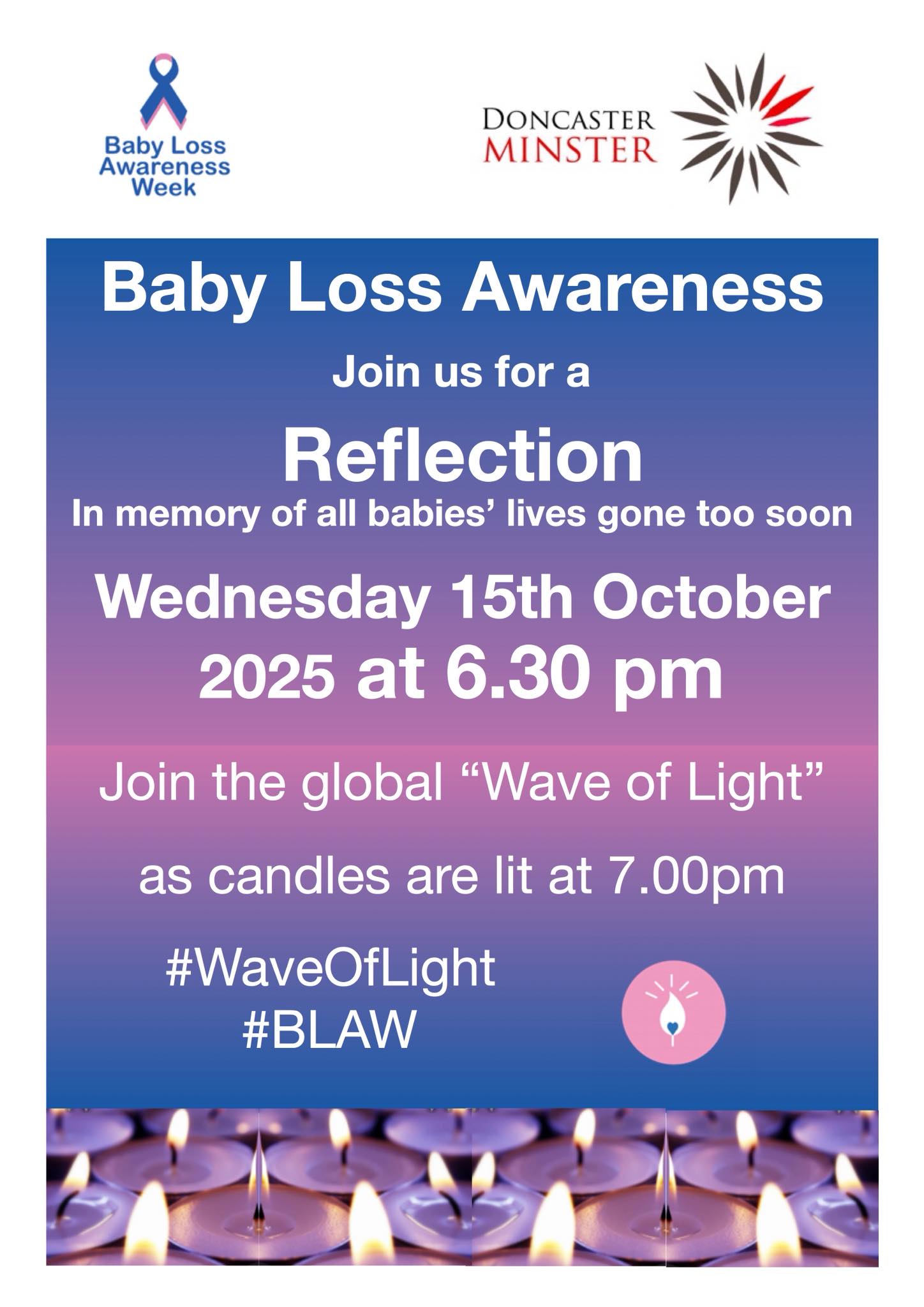 A service of reflection will take place for all who have lost babies during pregnancy or soon after birth. Join the global “Wave of Light” as candles are lit at 7.00 pm.