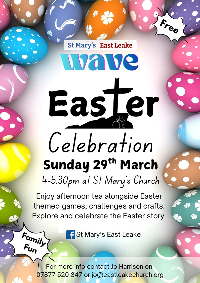 A free family friendly Easter Celebration on Sunday 29th March, 4-5.30pm at St Mary's Church East Leake. The clocks will have gone forward so come for afternoon tea alongside Easter themed crafts, games and challenges. Explore the Easter story. Contact Jo on 07877 520 347 or [email protected] for more info and/or tell us about dietary needs.